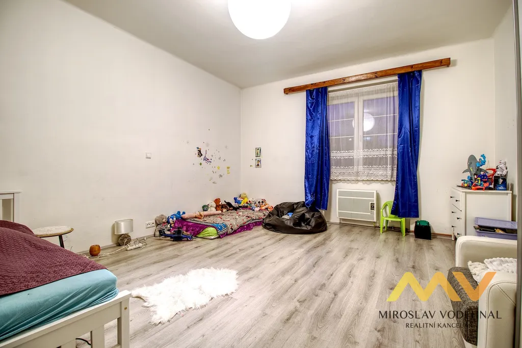 Dispozice: 2x pokoj, kuchyň, koupelna, WC, předsíň. Jedná se o částečně zařízený byt s průchozími pokoji, nová plovoucí podlaha, nová plastová okna. Kuchyň je vybavena starší kuchyňskou linkou s novým komb. sporákem, lednicí s mrazákem, mikrovlnnou troubou. V obývacím pokoji je, jídelní stůl se židlemi. V ložnici velká šatní skříň. Koupelna s vanou, toaleta je samostatně. V prostorné předsíni je prostor na pračku i sušičku prádla. Internet zaveden (300 Kč/měsíc), vytápění lokální (nové wafky), ohřev vody el. bojlerem. Ve vnitrobloku za domem je zeleň a hřiště. Sklep není k dispozici.