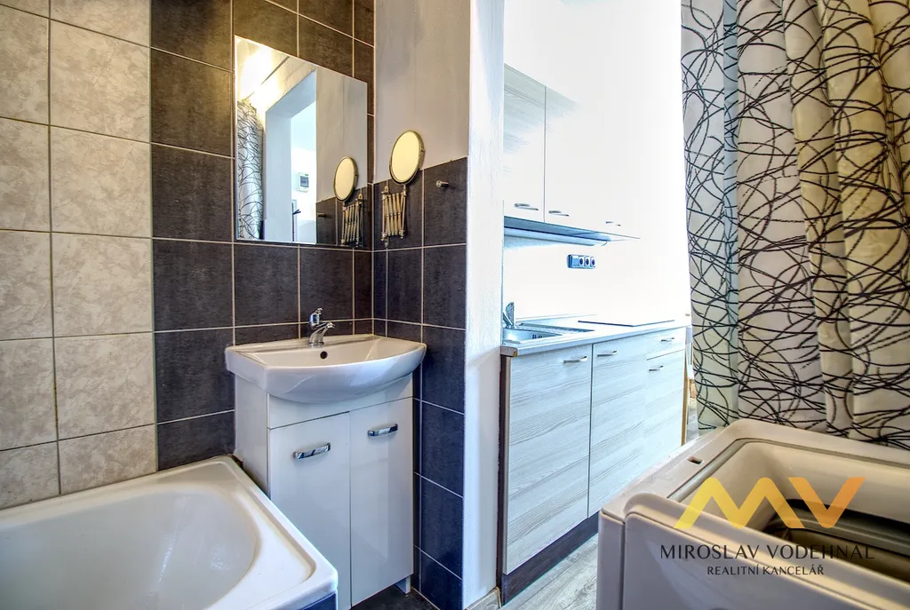 Byt je světlý a útulný, dispozičně řešený jako obývací pokoj s kuchyňským koutem, koupelna s WC a lodžie. Kuchyňská linka je nová a vybavená spotřebiči (malá lednice, sklokeramická varná deska, mikrovlnná trouba), byt je navíc kompletně zařízený – k dispozici je postel, jídelní stůl se židlemi i úložné skříně, smart TV. Koupelna se zděným jádrem je modernizovaná a nabízí vanu, umyvadlo se skříňkou, toaletu a pračku. Podlahy tvoří PVC a dlažba, plastová okna mají žaluzie. Sklep není k dispozici. Nově vymalováno.