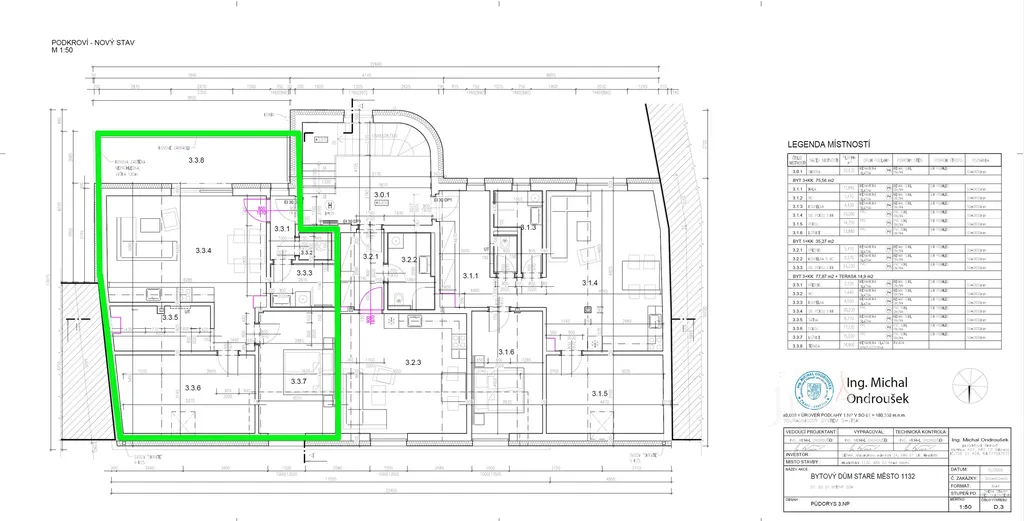 Byt se nachází ve 3. nadzemním podlaží třípodlažního cihlového domu a je navržen jako jednopodlažní.