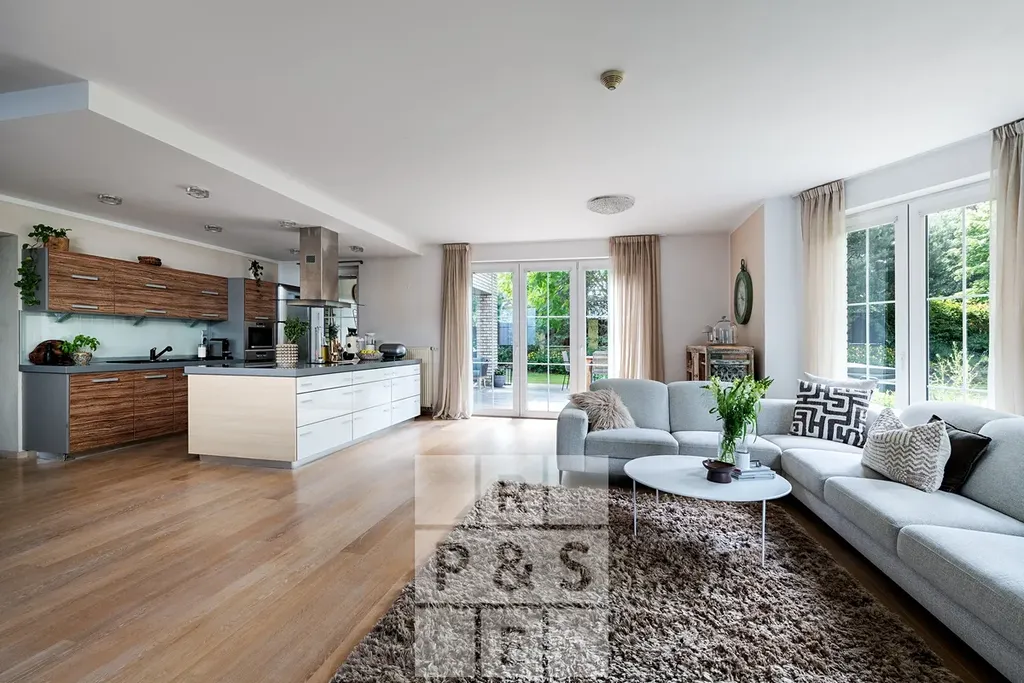 Dominantou domu je téměř 50m² velký, prosvětlený obývací pokoj s francouzskými okny, krbem a vstupem na velkou terasu. Kuchyňská linka s kamennou pracovní deskou, plně vybavená spotřebiči, navazuje na komfortní jídelní kout. Nechybí tři koupelny, velkorysá šatna, domácí kino ani pokoje s balkonem. V domě jsou dřevěné podlahy a schodiště, podlahové vytápění doplněné krbem zajišťuje tepelný komfort po celý rok. Vytápění zajišťuje plynový kotel, elektroinstalace 230 V a 3 fáze s jističem 25 A.