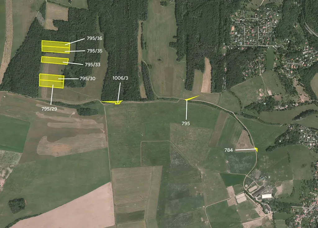 KÚ Líšnice u Prahy: parcely č. 795/29 až 795/36 (orná půda, BPEJ 1.35 Kč).