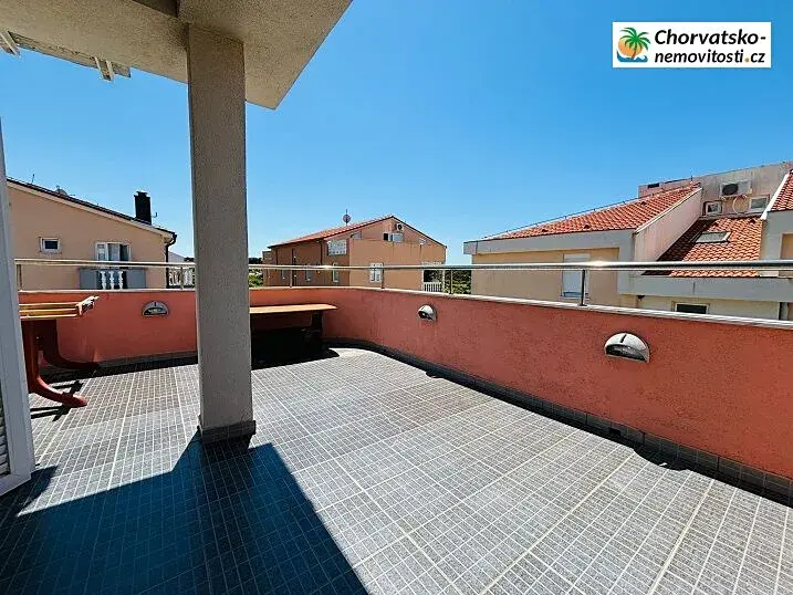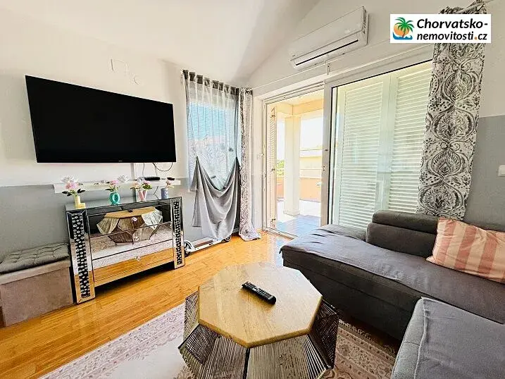 Chorvatsko-Nemovitosti.cz má pro Vás dvoupokojový, velký a krásně vybavený apartmán s velkou terasou a výhledem. Pláž je vzdálena 15 minut chůze, 390m. Apartmán má velikost 53m2 a je uzpůsobený pro přespání menší rodiny. Nedaleko apartmánu je pláž Vrtić, která je písečná s kamínky. Má velkou terasu na kterou vstoupíte přímo z obývací kuchyně. V okolí můžete najít palmy, které vám zaručí stín při vaší klidné procházce. Auto můžete zdarma parkovat pod apartmánem viz foto a můžete jej kontrolovat.. Nedaleko se nachází centrum kde naleznete obchody a pizzerie případně kebab. Podrobně o apartmánu: