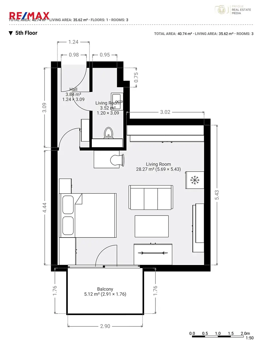 Dispozice bytu je promyšlená do posledního detailu. Vstupní předsíň, obývací prostor s kuchyňským koutem, koupelna se sprchovým koutem. Součástí bytu je útulný balkon orientovaný na jihozápad, který nabízí příjemné posezení. Ráno si zde můžete vychutnat kávu, večer sklenku vína po práci. Je to prostor, kde můžete odpočívat, číst nebo si jen na chvíli vydechnout od ruchu města.