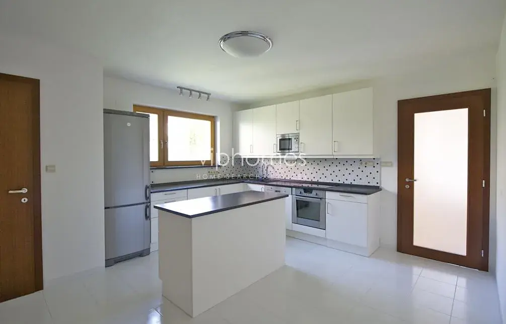 Bezpečnostními dveřmi vstoupíte do prostorné předsíně, odkud je možnost vstupu do jednotlivých místností. Bytu dominuje obývací pokoj s přilehlou jídelnou (50 m2), který je orientován na jih a je propojen s rozlehlým balkonem. Samostatná kuchyň (se špízí) disponuje kompletně vybavenou kuchyňskou linkou (lednice, sklo-keramická deska, trouba, myčka, pračka ze sušičkou, mikrovlnná trouba). Dále byt nabízí 3 samostatné ložnice, 2 koupelny, (jedna koupelna sprchový kout a toaleta, další koupelna s vanou), samostatnou toaletu s bidetem a velkou vstupní halu se šatnou. Byt je realizován ve vysokém nadstandardu a to nejen díky vybavení, ale i díky použitým materiálům a značkových zařizovacích předmětů. V bytě jsou dřevěné podlahy a dlažba, bezpečnostní dveře, domácí vrátný. Okna mají nainstalované el. rolety. Parkování pro jeden vůz v garáži v ceně.