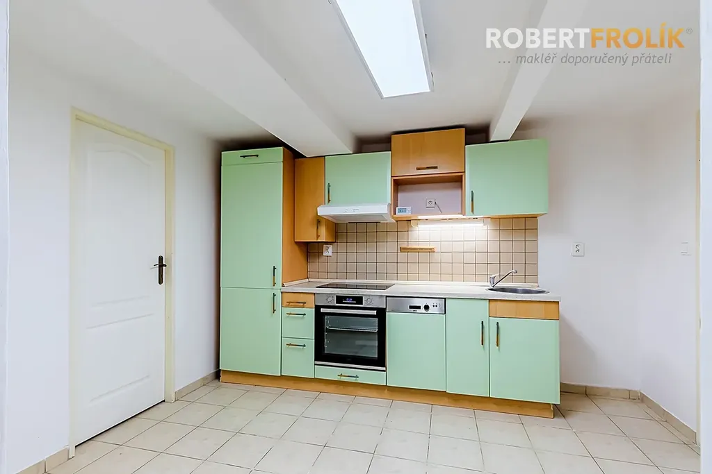 Najdete tu hlavní prostor (jako obývák) s výstupem na terasu, ložnici, samostatný kuchyňský kout, velkou technickou místnost (lze využívat i jako šatnu), malou komoru, šatní kout v chodbě a koupelnu. Starý nábytek z technické místnosti lze odvézt.