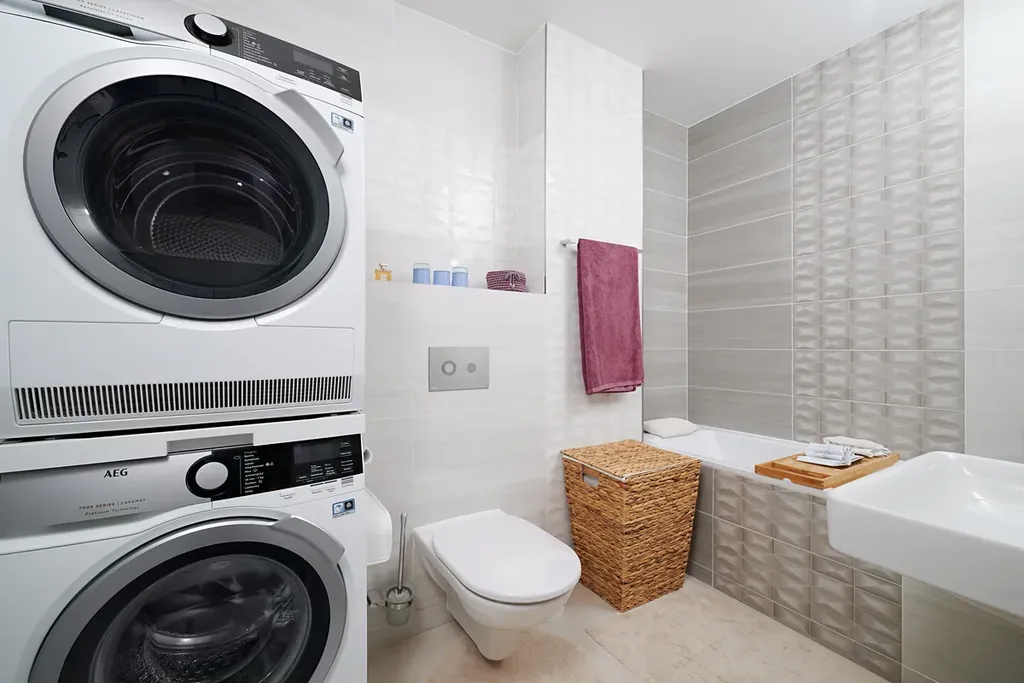 V patře jsou dvě samostatné ložnice a druhá koupelna s vanou, včetně pračky a sušičky.
