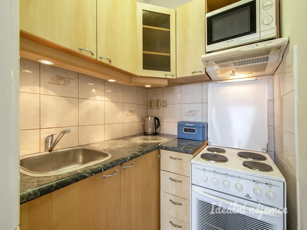 Byt se nabízí částečně vybavený. Kuchyně disponuje lednicí, sporákem, mikrovlnnou troubou a digestoří, v jídelním koutě najdeme stůl se židlemi a komodu. V pokoji pak pohovku, konferenční stolek a obývací stěnu. V koupelně je sprchový kout, umyvadlo, toaleta a pračka.