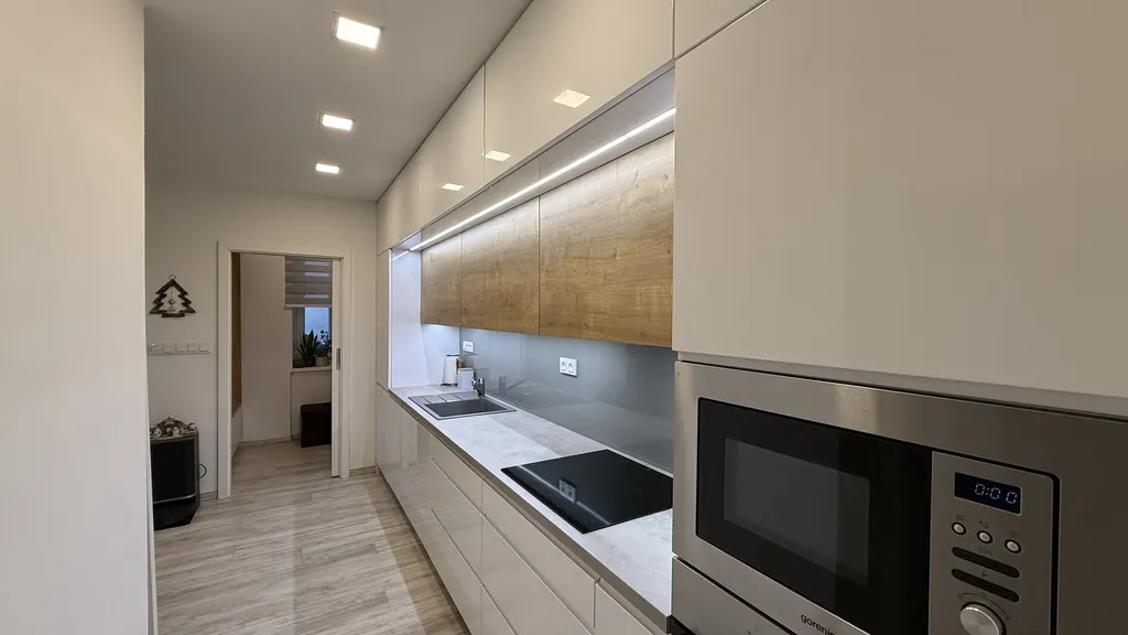 Byt je situován ve 2.NP a prošel v roce 2019 kompletní rekonstrukcí. Od vylití podlah a položení moderní vinylové krytiny, přes kompletní výměnu elektroinstalace v mědi s 3 fázovým jističem, obměnu veškerých rozvodů vody a odpadů, zbudování prostorné koupelny se sprchovým koutem, WC a prádelnou, osazení stolařem zhotovené nové kuchyně s moderními elektrospotřebiči, zhotovení sádrokartonových podhledů, rozmístěním úsporných LED světel do jednotlivých prostor bytu a to jak přímého, tak nepřímého osvětlení a v neposlední řadě také výměnou původních oken za moderní plastová.