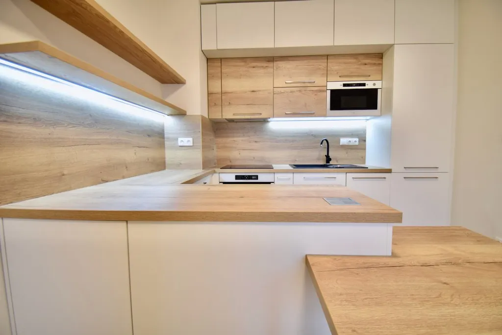 Dále se v bytě nachází prostorná ložnice s výhledem do klidného vnitrobloku. Obývací pokoj s kuchyňským koutem disponuje lednicí, mrazákem, troubou, varnou deskou, digestoří a myčkou. Kuchyňská linka byla vyrobena na zakázku.