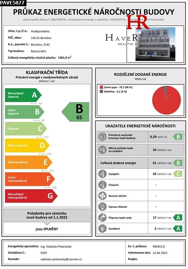 Dovolujeme si Vám nabídnout s platností od února 2026 do pronájmu pěkný byt 1+kk, 40 m2 s balkonem 2,63 m2 v novostavbě bytového domu v ulici Hodějovského č.p.2456 v Benešově. Byt se nabízí ve 2.NP (1. patro) novostavby zatepleného bytového domu s výtahem a dispozičně je členěn na: vstupní chodbu (2,47 m2), koupelnu se sprchovým koutem a WC (3,71m2), a obývací pokoj (31,25m2) spojený s kuchyňským koutem a vstupem na balkon (2,63m2). Orientace bytu na parkoviště (východ). Vytápění bytu a ohřev teplé vody zajišťuje centrální plynový kotel. Za poplatek (1.200,-Kč – 1.500,-Kč měsíčně) si lze pronajmout vlastní parkovací stání v přízemí domu nebo ve dvoře. Požadované měsíční nájemné za byt činí 13.900,- Kč + poplatky cca 3.000,- Kč včetně spotřeby elektrické energie v bytě. Jistota, dříve (kauce) činí 25.000,- Kč. Provize pro RK = 1měsíční nájem vč. služeb. V bytě je instalována nová kuchyňská linka se spotřebiči: sklokeramická varná deska 2 plotýnka, pečící trouba, digestoř s odtahem. V koupelně je sprchový kout, závěsné WC, umyvadlo se skříňkou, otopný žebřík, zrcadlo s osvětlením. PENB třída „B“ – velmi úsporná. Byt je určený maximálně pro 2 osoby s úmyslem dlouhodobého bydlení. Bez domácích mazlíčků. V blízkosti domu se nachází restaurace „Na Bejkárně“, prodejna potravin, vlakové i autobusové nádraží, základní i mateřské školy, sportoviště, automyčka, atd. V Benešově je veškerá občanská vybavenost a dobré dopravní spojení do Prahy a Českých Budějovic. V případě Vašeho zájmu o prohlídku bytu nás neváhejte kontaktovat na uvedeném místě.