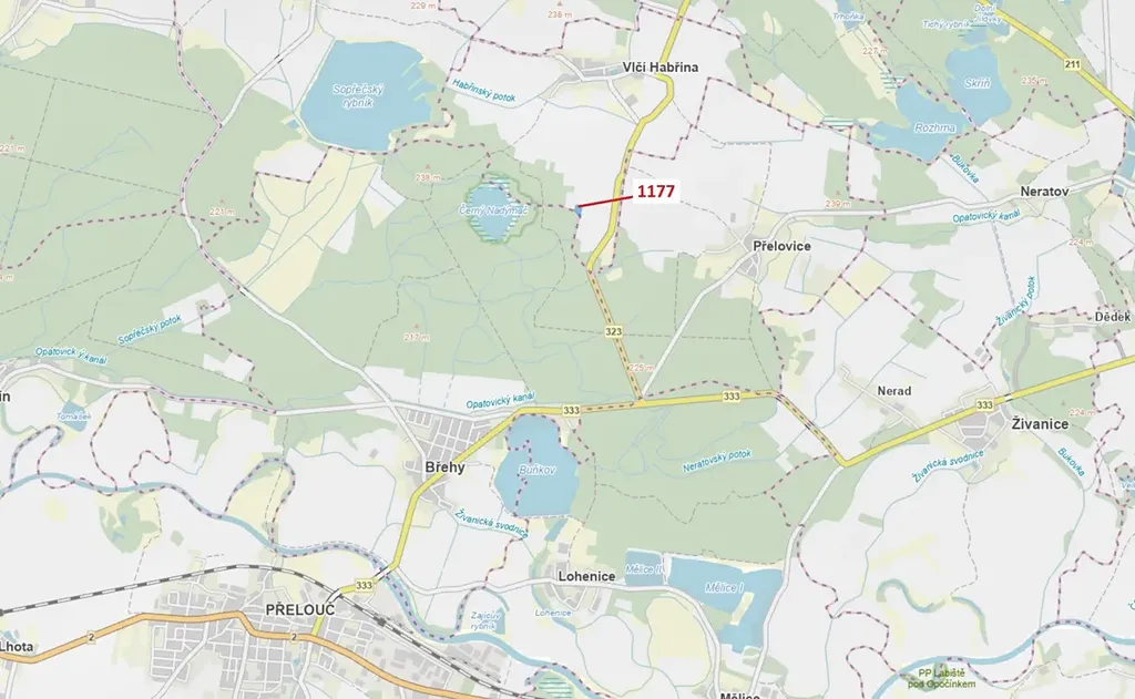 Lesní pozemek o výměře 4658 m2, parcelní číslo 1177, podíl 1/1, katastrální území Vlčí Habřina, obec Vlčí Habřina, obec s rozšířenou působností Pardubice, okres Pardubice, Pardubický kraj. Po těžbě.
