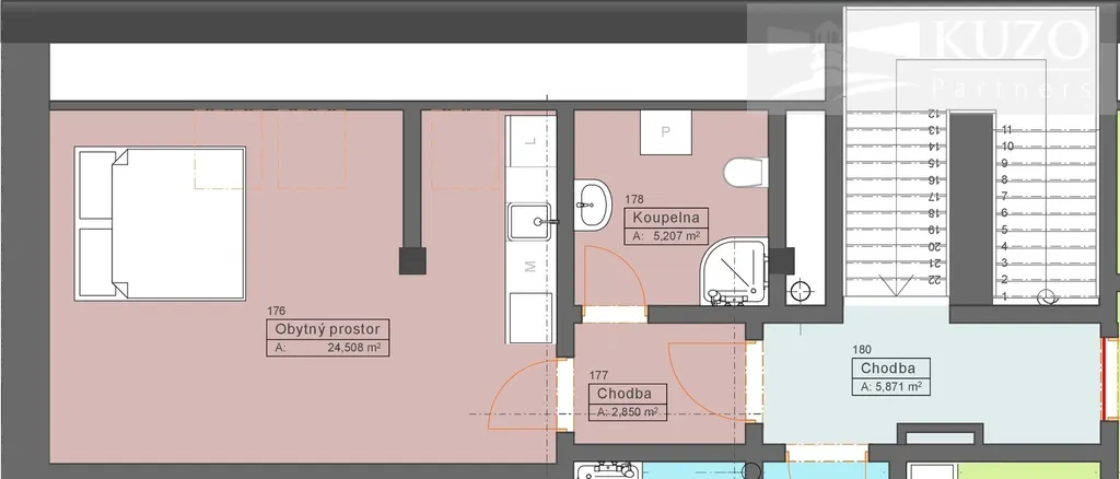 Byt č. 9 – dispozice 2+kk (42.83 m2) – cena 4.711.300 Kč (Unikátně řešený prostor s oddělenou ložnicí, ideální pro jednotlivce, pár i jako investice)