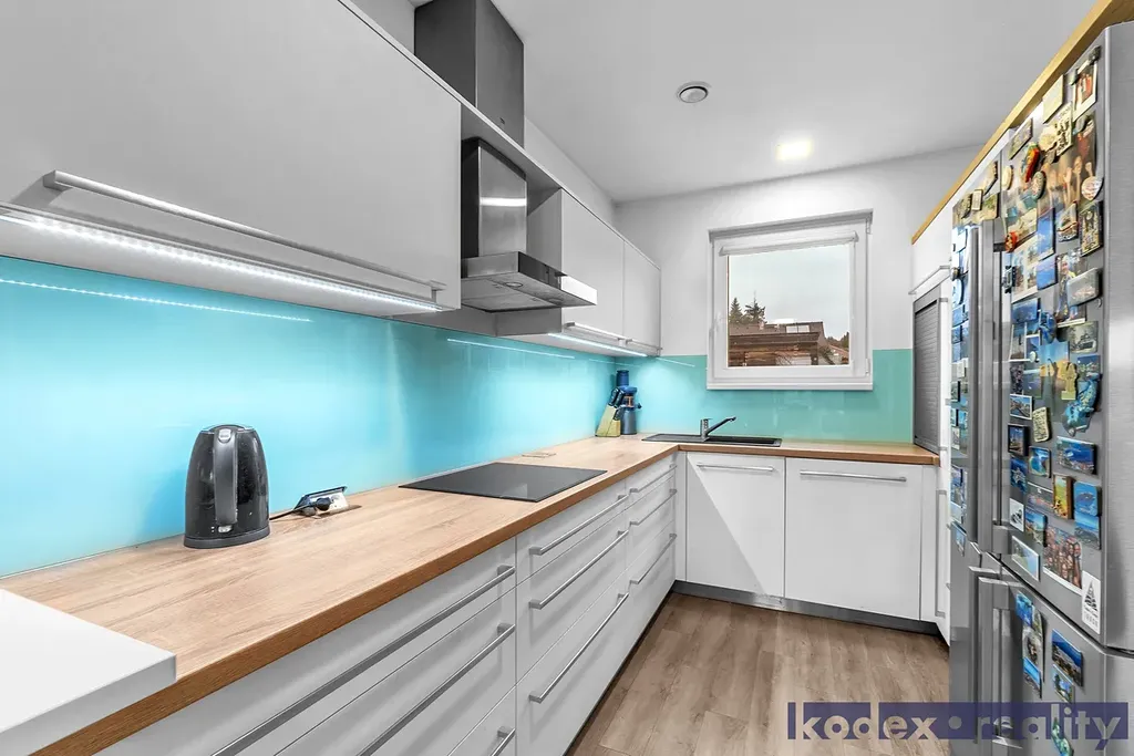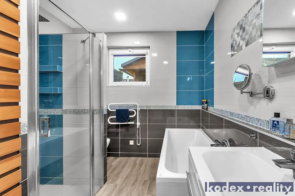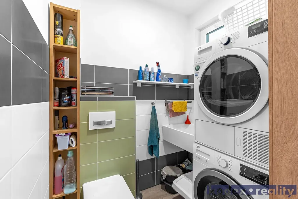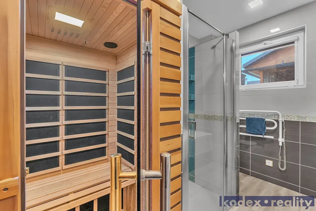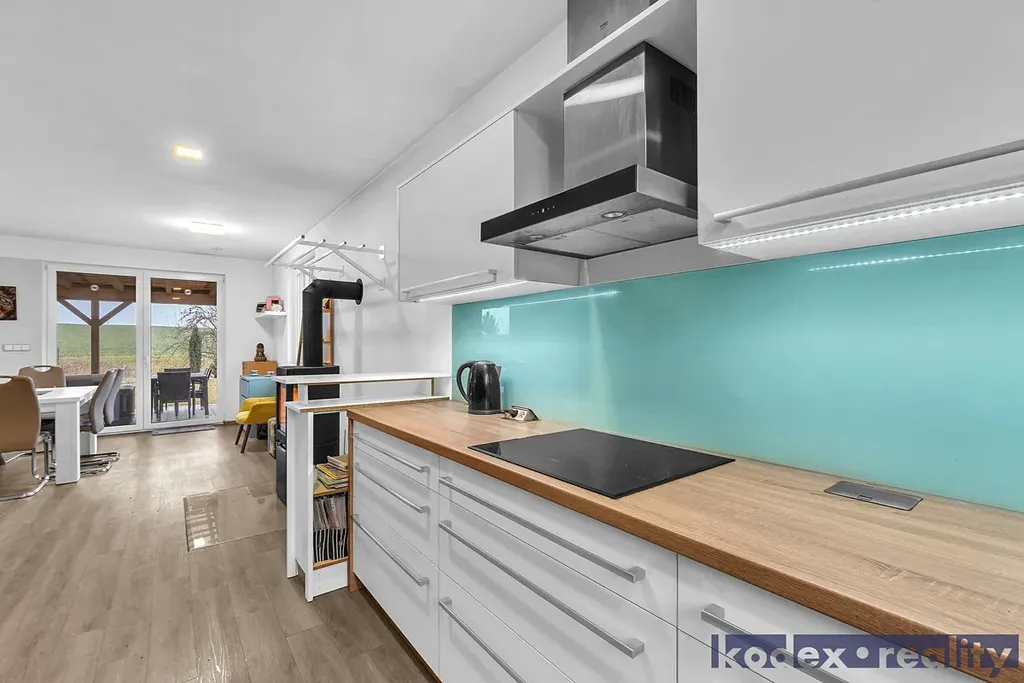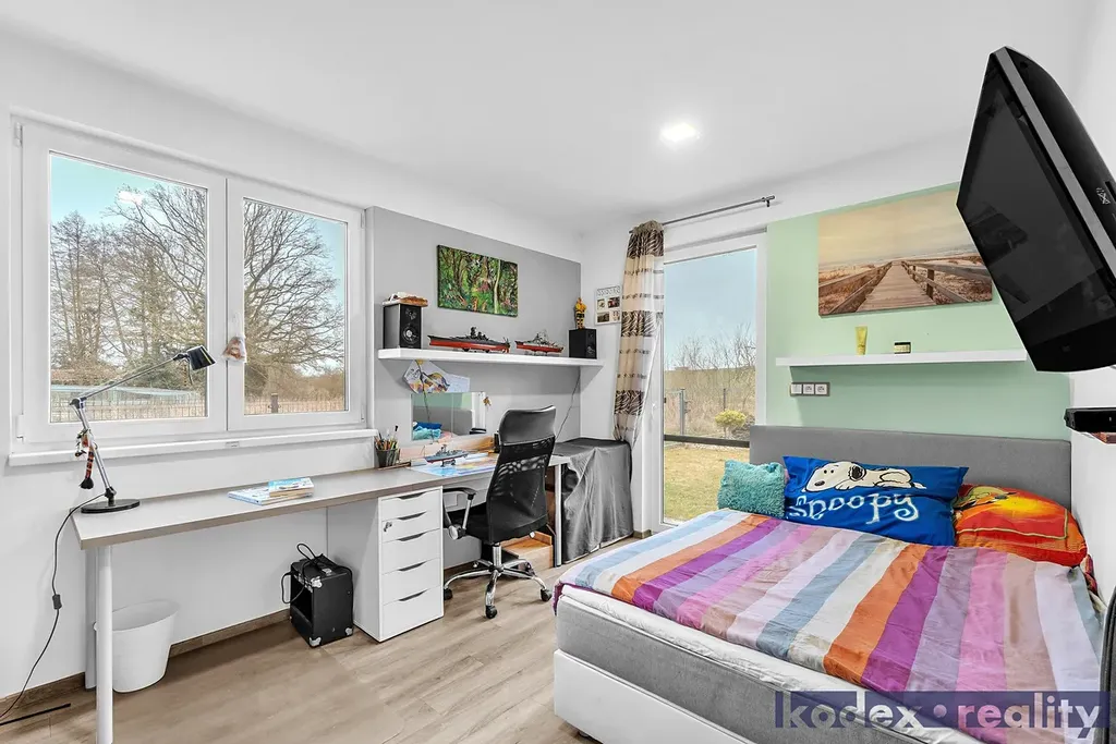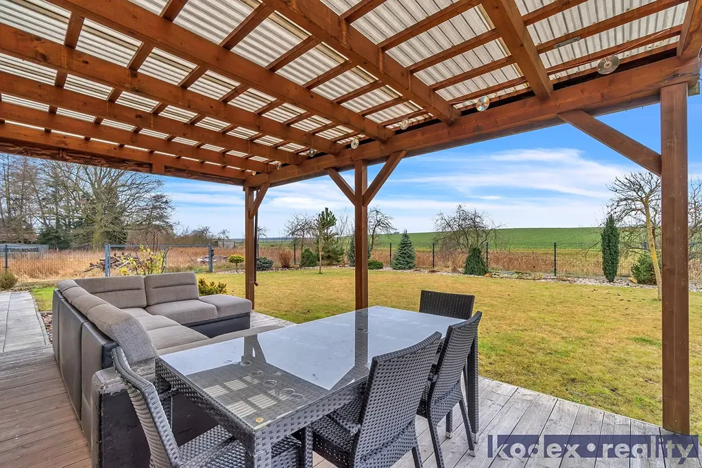 Dispozice: krytý vstup, zádveří s vestavěnou skříní a technickou místností, obytná místnost s kuchyňským koutem se spíží, chodba s přístupem na půdu, koupelna s vanou, sprchovým koutem a saunou, komora, ložnice, dětský pokoj a pracovna a krytá terasa. Vedle RD stojí dílna a sklad na kola, motorky apod. Před domem je postaveno velké garážové stání pro 2-3 auta včetně dodávky. Pozemek je kompéletně oplocen a vpředu je elektricky ovládaná vjezdová brána. Okrasná zahrada je vybavena zavlažovacím systémem, venkovní sprchou, bazeném a krytou terasou.