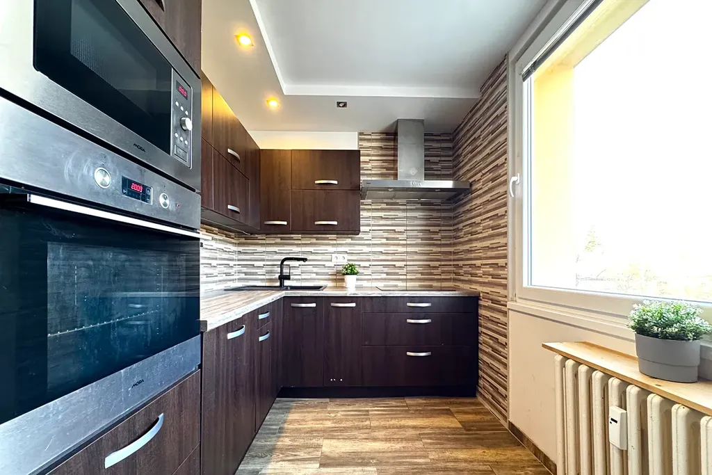 Byt prošel před několika lety kompletní rekonstrukcí. Na podlahách je kombinace dlažby a linolea. K dispozici je kuchyňská linka na míru s vestavěnými spotřebiči, včetně pračky. Koupelna je moderní, se sprchovým koutem a toaletou.