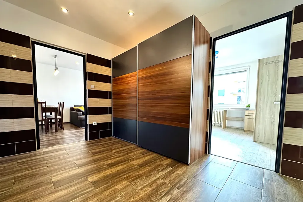 Byt má velmi praktickou dispozici – všechny pokoje jsou neprůchozí, takže každý člen domácnosti má dostatek soukromí. Dominantou bytu je prostorná vstupní chodba, ze které se vstupuje do jednotlivých místností.