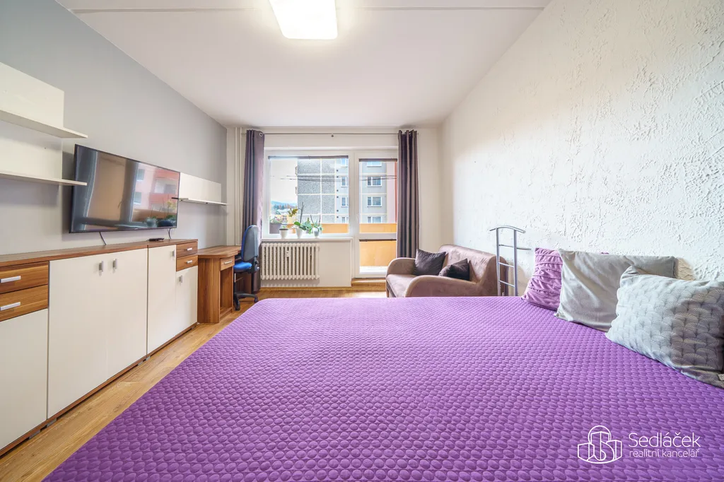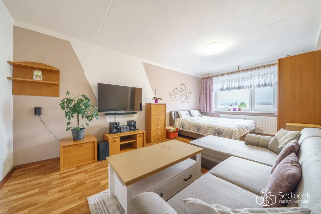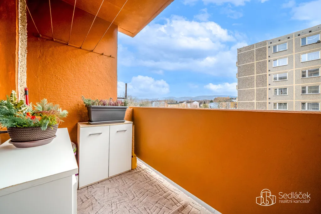 Velkou výhodou bytu je prostorná zasklená lodžie, která nabízí místo k posezení i mimo letní sezónu.