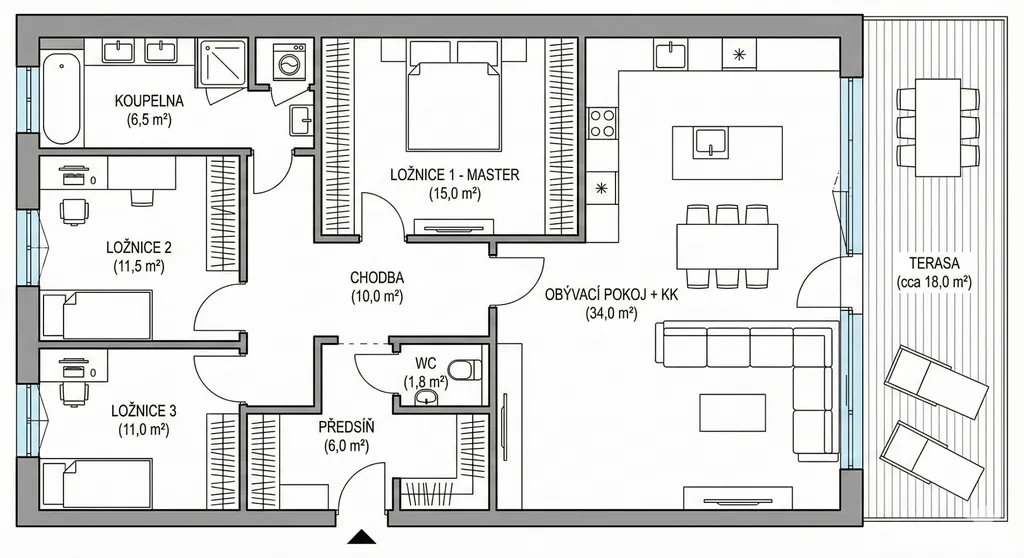 K bytu náleží prostorná terasa o výměře 18 m², jež nabízí krásný výhled a skvěle poslouží pro relaxaci po náročném dni. Tato nemovitost také umožňuje pronajmutí dvou parkovacích míst, za cenu 5 000 KČ (2 x 2500 KČ), což zajišťuje pohodlné a bezstarostné parkování. Součástí vybavení bytu je klimatizace, což přispívá k udržení ideálního klima v průběhu celého roku.