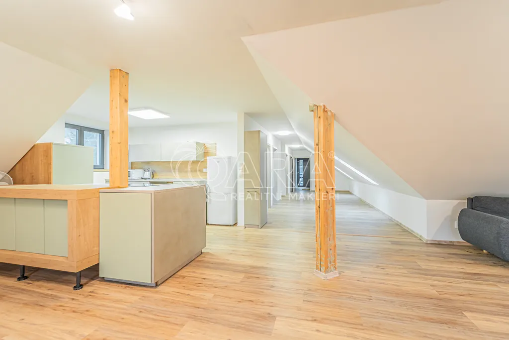 Po vstupu do bytu se nachází dlouhá vstupní chodba s šikminami a střešními okny, která dodávají prostoru dostatek denního světla. Z chodby se postupně vstupuje do první samostatné ložnice, odděleného WC, prostorné koupelny s vanou, sprchovým koutem a druhou toaletou. Dominantou bytu je obývací pokoj propojený s moderní kuchyní. Z obývací části jsou přístupné další dvě samostatné, přibližně stejně velké ložnice, ideální pro dětské pokoje, pracovnu nebo hostinský pokoj.