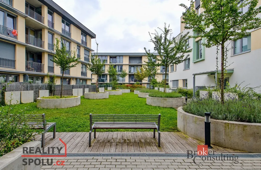 Dispozice bytu: obývací pokoj s kuchyňským koutem – kuchyňská linka zn. Ikea se spotřebiči (lednice, sklokeramická deska, el. trouba, digestoř), předsíň (4 m²) s vestavěnou skříní, koupelna (4,8 m²) je prostorná se sprchovým koutem, umyvadlem, toaletou a prostorem na pračku (není součástí). Výhled z bytu je do společného atria se spoustou zeleně, nedaleko se nachází park Židovské pece. Orientace oken na východ a na jih, okna jsou vybavena interiérovými žaluziemi a předokenními roletami.