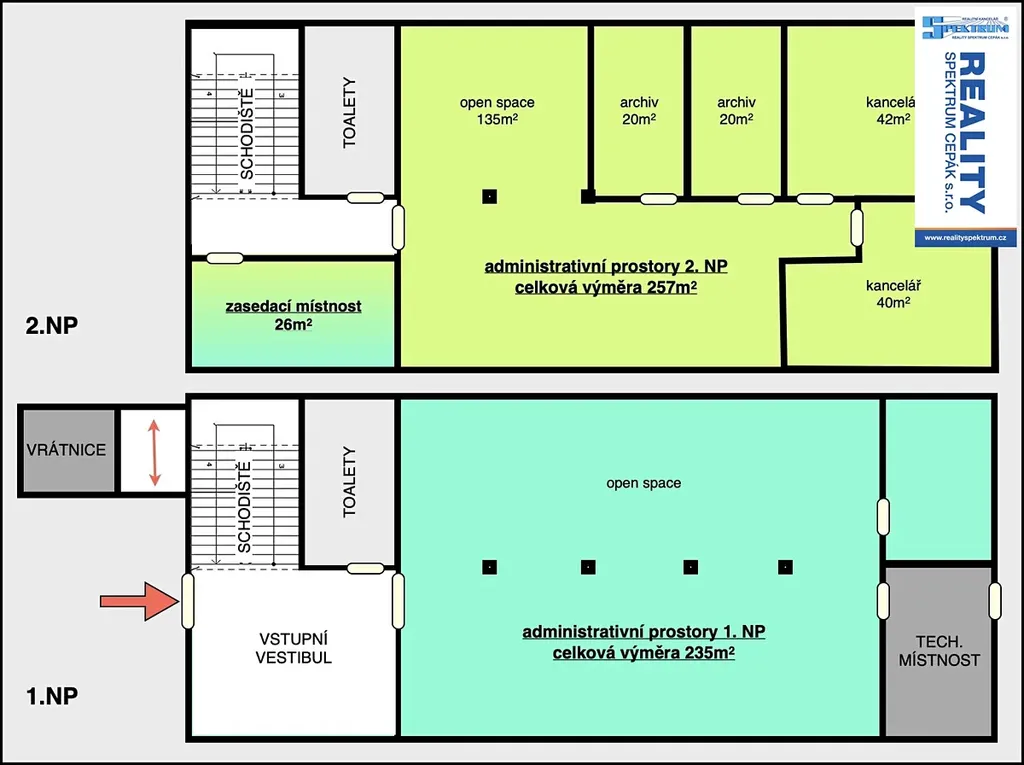 Pronájem moderních administrativních prostorů ve zděné budově, která je součástí komerčního areálu na okraji Lišova v Hůrecké ulici. Prostory je možné využít dle schématu viz. fotografie. V přízemí je vstupní vestibul a sdílený administrativní prostor pro celkem 10 pracovních pozic a celkové výměře 235m2. V patře je společná jednací místnost a druhý administrativní prostor rozdělený na sdílenou kancelář o 6 pracovních pozicích a čtyři samostatné kanceláře nebo archivy o celkové výměře 257m2. Prostory jsou provozně nezávislé vč. přístupů a samostatných toalet na každém patře. K dispozici jsou parkovací plochy pro zaměstnance i návštěvy. V případě potřeby je možné otevřené prostory rozdělit na menší kanceláře. Přístup do areálu je 24/7. Areál má stálou ostrahu a vrátnici. Možnost pronájmu dalších prostorů v areálu (výrobní prostory, sklady, manipulační plochy) viz. objekt S a B.