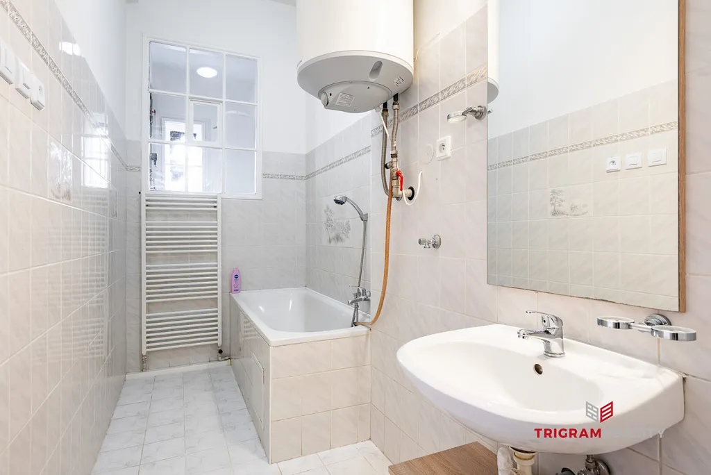 Moderní kuchyňská linka je vybavena elektrickou troubou, varnou deskou, digestoří, myčkou a dřezem. Z kuchyně i ložnice je příjemný výhled do klidného vnitrobloku. Koupelna disponuje vanou a umyvadlem se skříňkou. Plynový kotel zajišťuje ohřev vody, vytápění je dálkové.