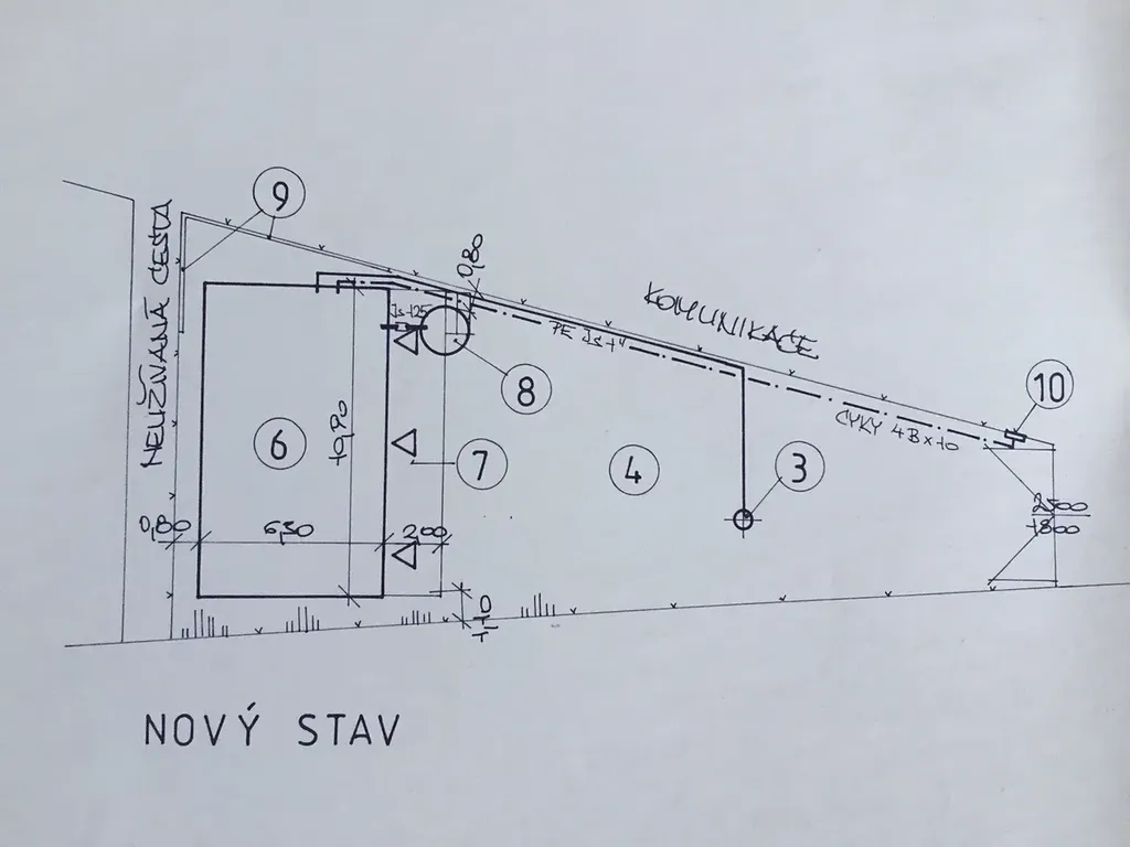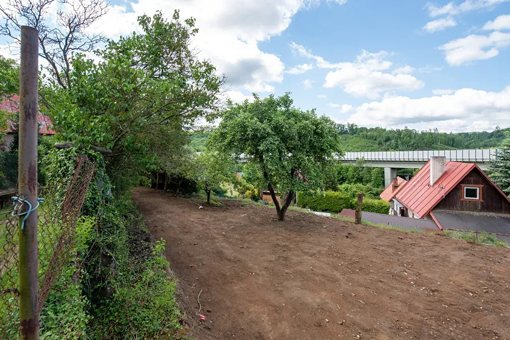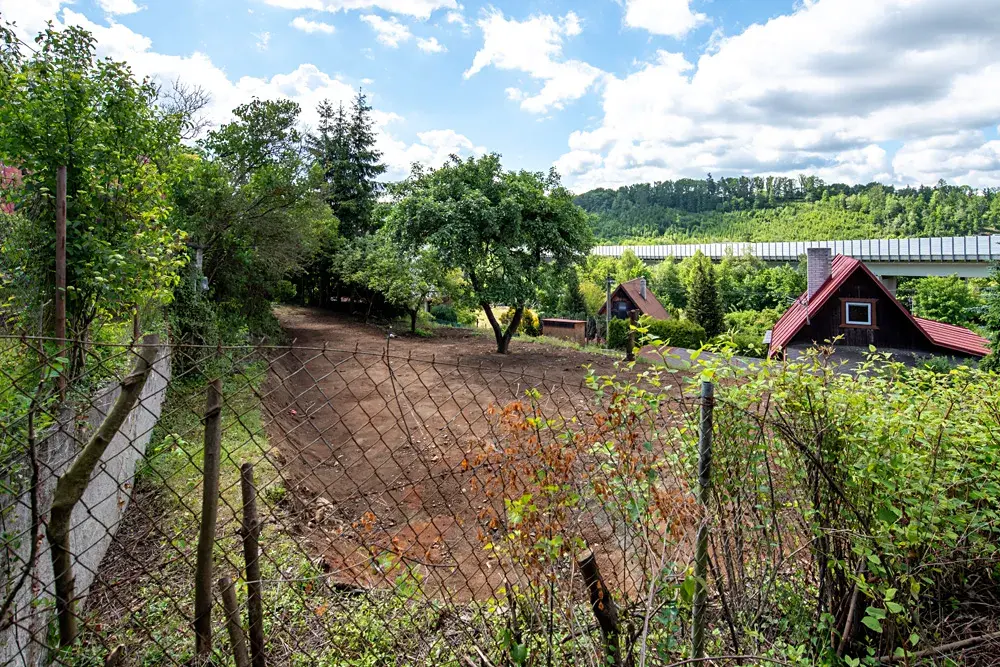 Na pozemku není aktuálně žádná stavba, ale součástí prodeje je projektová dokumentace a platné stavební povolení na výstavbu jednopodlažní rekreační chaty s pultovou střechou a zastřešenou verandou.