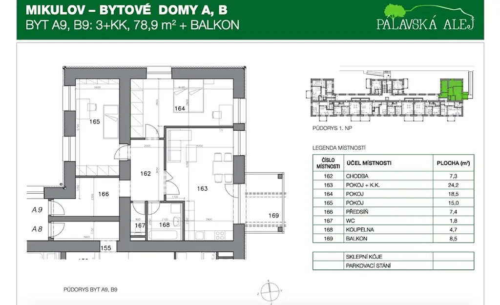 Nachází se v 1.np bytového domu v Pálavské aleji. Byt má prostornou a vzdušnou hlavní místnost s kuchyňským zázemím, velká okna a přímý vstup na balkón o rozloze 8,5m2.