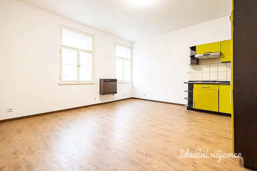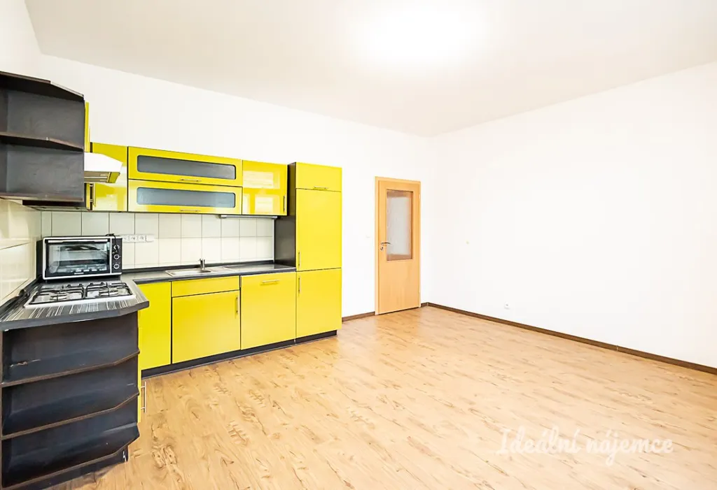 Dále je zde obývací pokoj společný s kuchyňským koutem. Kuchyně je zařízena plynovým sporákem, volně stojící troubou a digestoří. Dále se byt nabízí nezařízený. K dispozici je také lednice.
