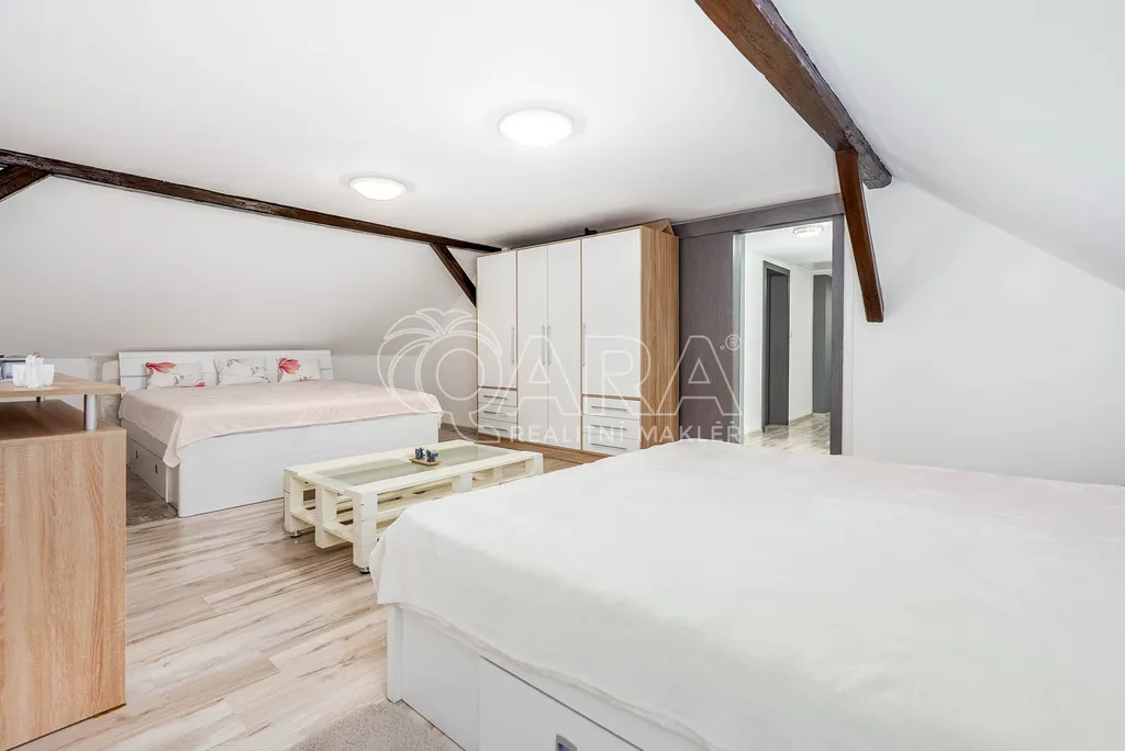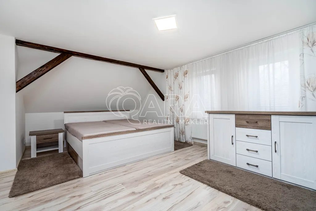 2 velké ložnice, 1 z nich s vlastní šatnou, dále pak pokoj a samostatná toaleta s umyvadlem. Z chodby je přístup výsuvnými schůdky na půdu (uložení méně potřebných věcí).