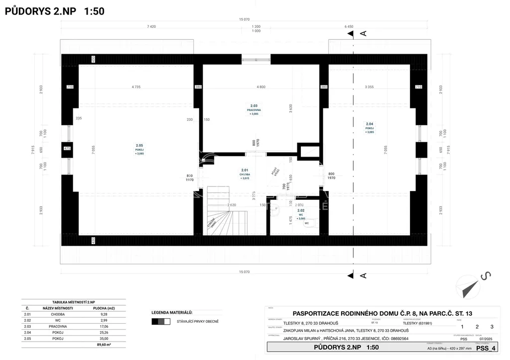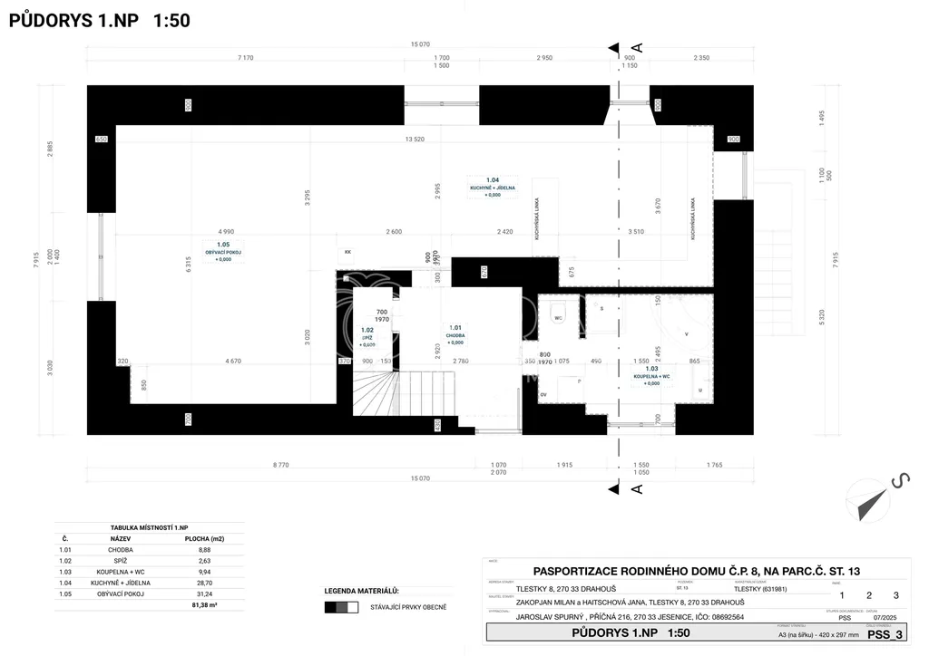 - Komín: V objektu se nachází 2 ks komínových těles. Z toho 1 ks je aktivně využíván a 1 ks je ubourán v úrovni půdního prostoru.