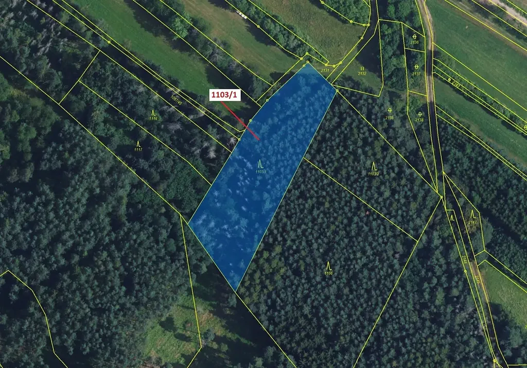 Lesní pozemek o výměře 3474 m2, parcelní číslo 1103/1, podíl 1/1, katastrální území Žďárec, obec Žďárec, obec s rozšířenou působností Tišnov, okres Brno-venkov, Jihomoravský kraj.