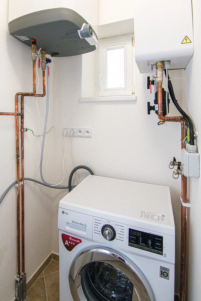 Vytápění zajišťuje vlastní elektrický kotel a ohřev vody elektrický bojler. Obojí umístěné v komoře na chodbě, kde je i nová pračka, viz. přiložené fotografie.