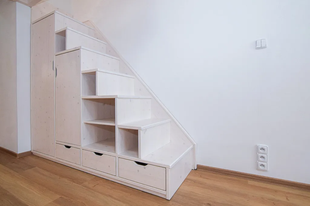 Hlavním prostorem bytu je místnost o velikosti 21 m², kde je na míru vyrobené patro na spaní s rozměry 2,8 x 1,2 m. Pod schody je praktický úložný prostor.