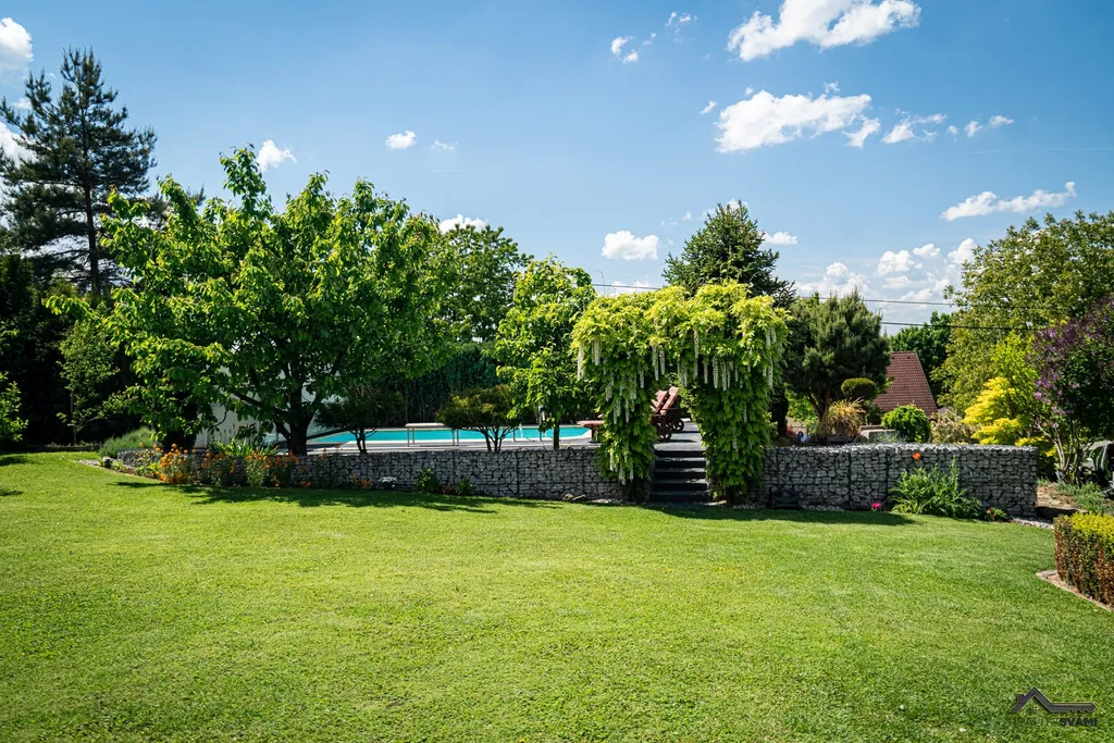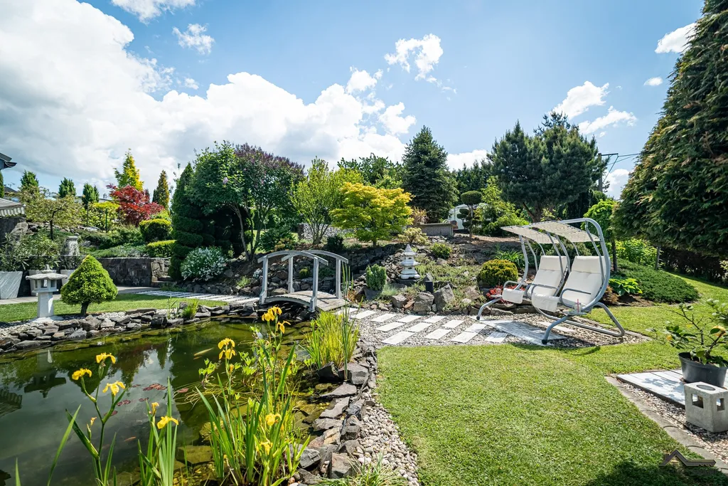 Zahrada je pečlivě navržená, s důrazem na estetiku i funkčnost – upravené okrasné dřeviny, promyšlené rozmístění záhonů a harmonické propojení s okolní přírodou vytvářejí dokonalé místo pro odpočinek.