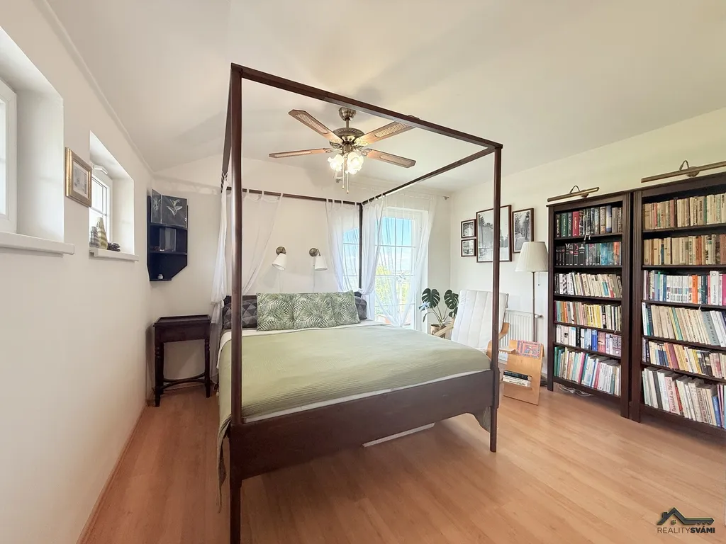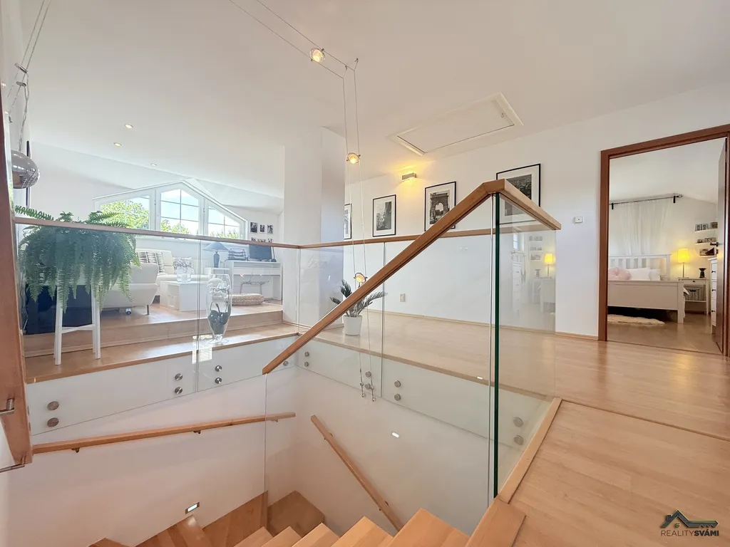 • Patro: hlavní ložnice s vlastní šatnou, moderní koupelna s vestavěným ozvučením, dvě další ložnice se společným balkonem a prostorná galerie s posezením.