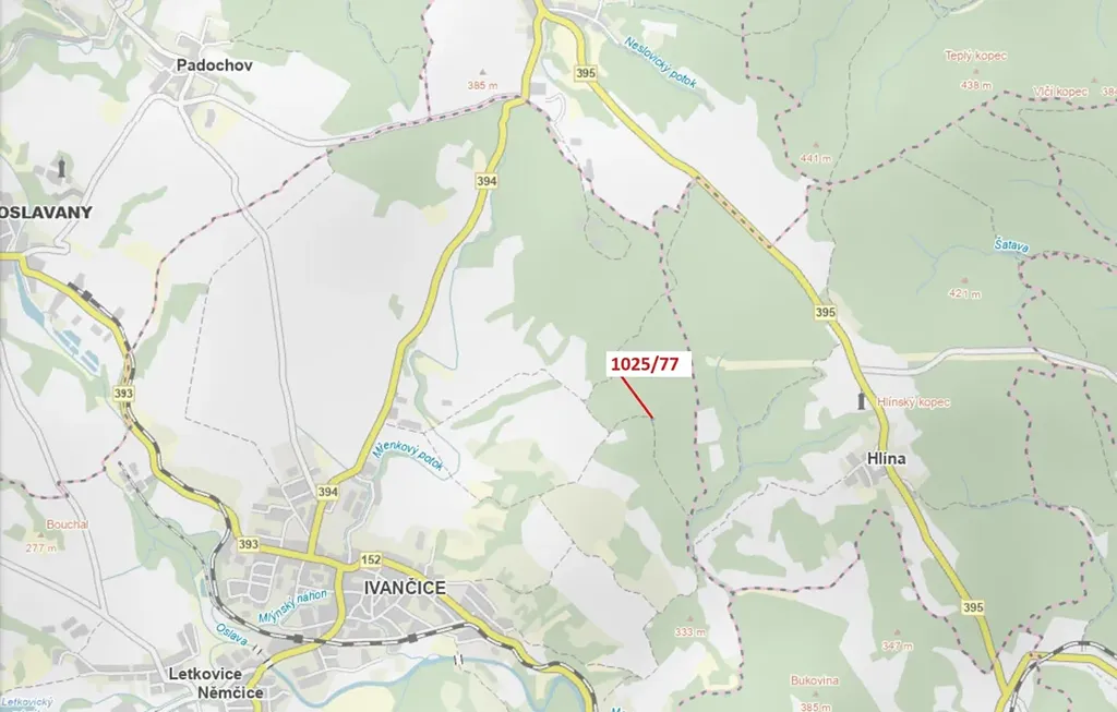 Lesní pozemek o výměře 140 m2, parcelní číslo 1025/77, podíl 1/1, katastrální území Kounické Předměstí, obec Ivančice, obec s rozšířenou působností Ivančice, okres Brno-venkov, Jihomoravský kraj.