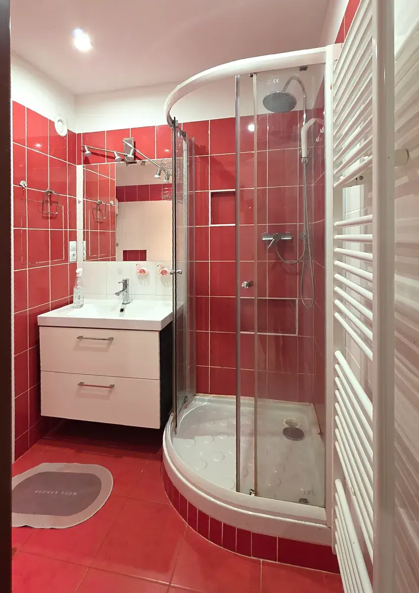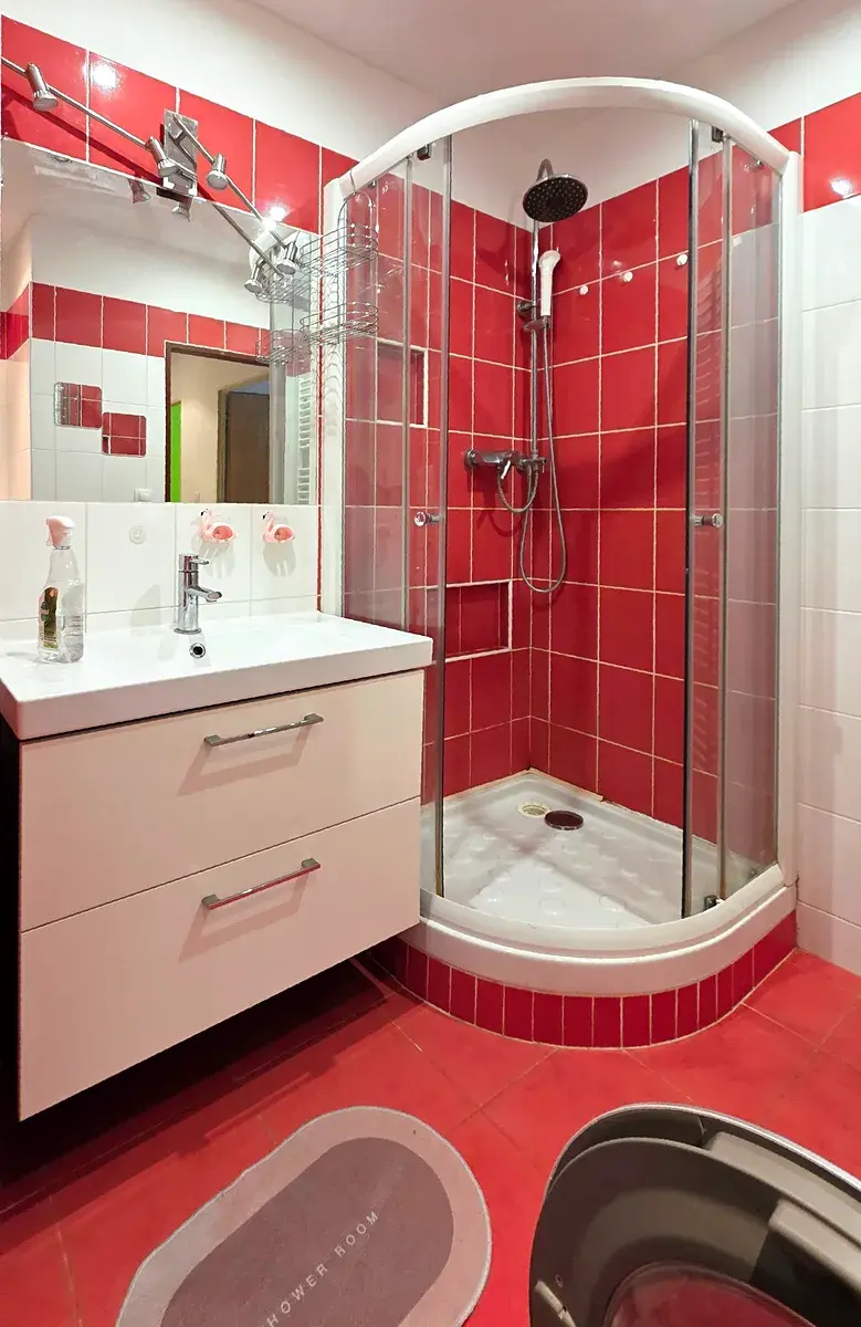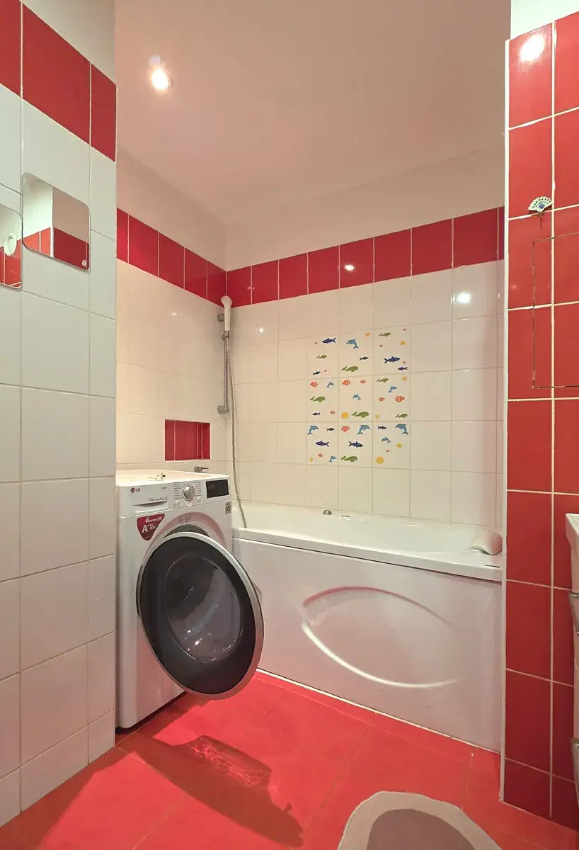Praktické zázemí: Koupelna s vanou a sprchovým koutem a samostatné WC s umyvadlem. V bytě najdete velkou vestavěnou skříň, která pojme vše potřebné.