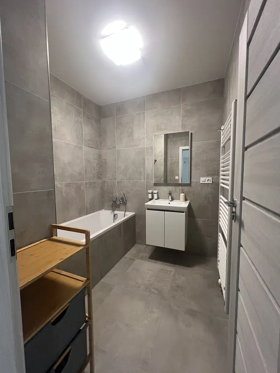 Koupelna je vybavena vanou, umyvadlem, skřínkou pod umyvadlem a otopným žebříkem.
