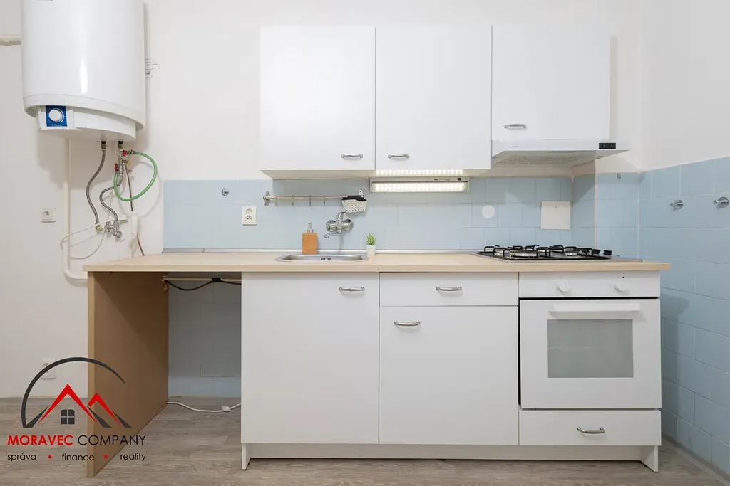 V bytě je kuchyně s kombinovaným sporákem, dále samostatný pokoj a koupelna s vanou, praktickými úložnými skříňkami a WC. Vytápění zajišťují plynové gamaty, ohřev vody je řešen elektrickým bojlerem.