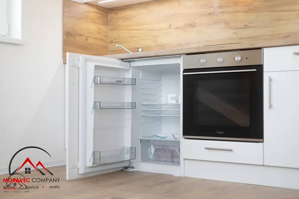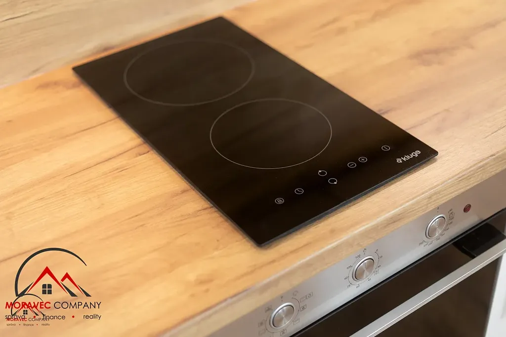 Vybavení bytu zahrnuje kuchyň s elektrickou troubou, indukční varnou deskou, digestoří a zabudovanou lednicí. Koupelna je vybavena sprchovým koutem a WC. Ohřev vody zajišťuje elektrický bojler.