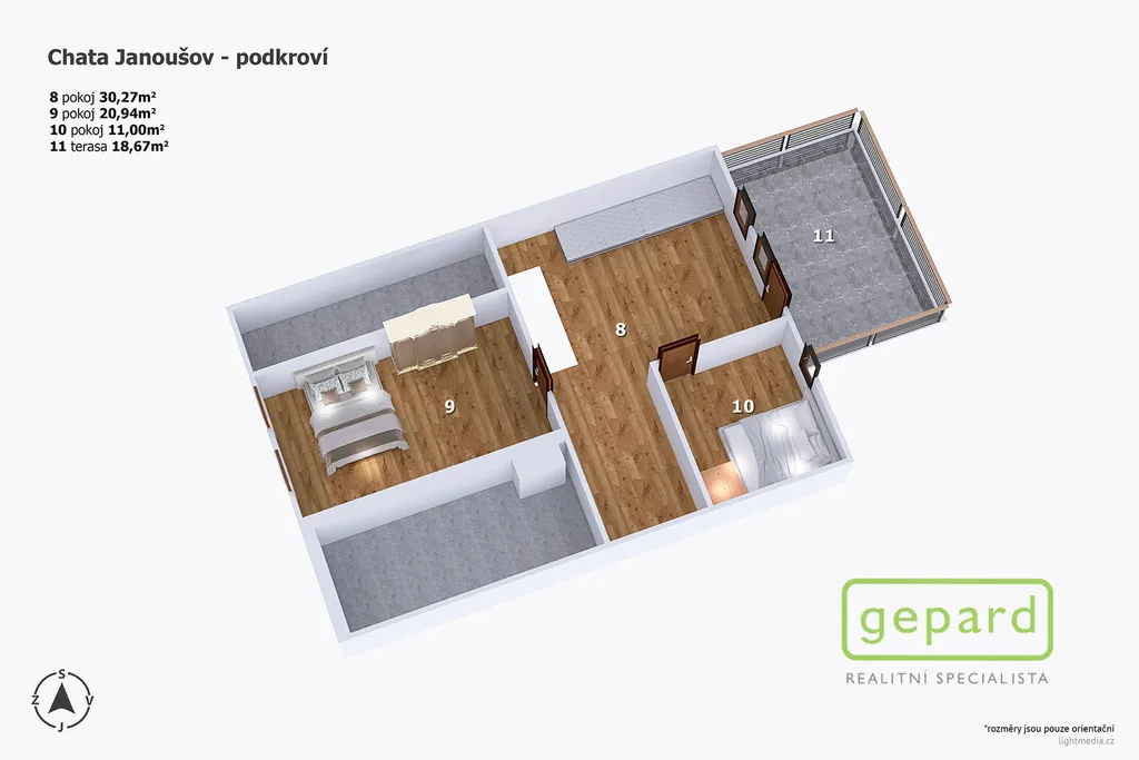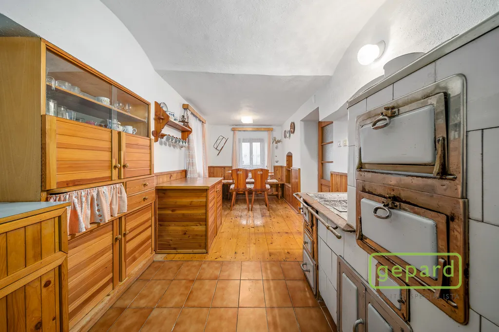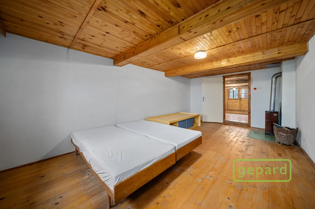 Dispozice: 1NP světnice, obývací pokoj, 2 místnosti ideální pro přizpůsobení na pokoje, nebo wellness, koupelna s toaletou, spíž. 2NP 2 samostatné ložnice, velká místnost s možností dalších lůžek a terasa. K chalupě náleží stodola pro uskladnění dřeva a na pozemku stojí i dřevěná kůlna sloužící jako zahradní domek.