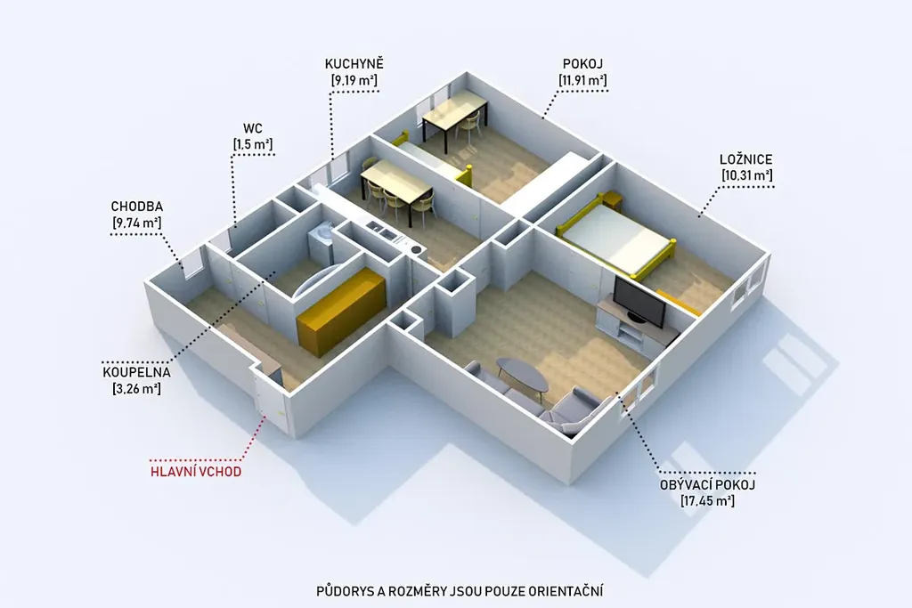 Byt tvoří tři samostatné pokoje, kuchyně bez kuchyňské linky, koupelna, samostatné WC a předsíň. K bytu náleží dvě sklepní kóje.