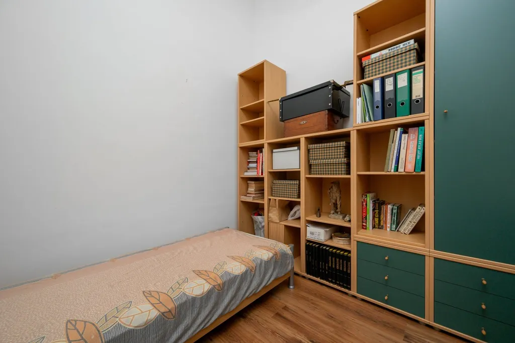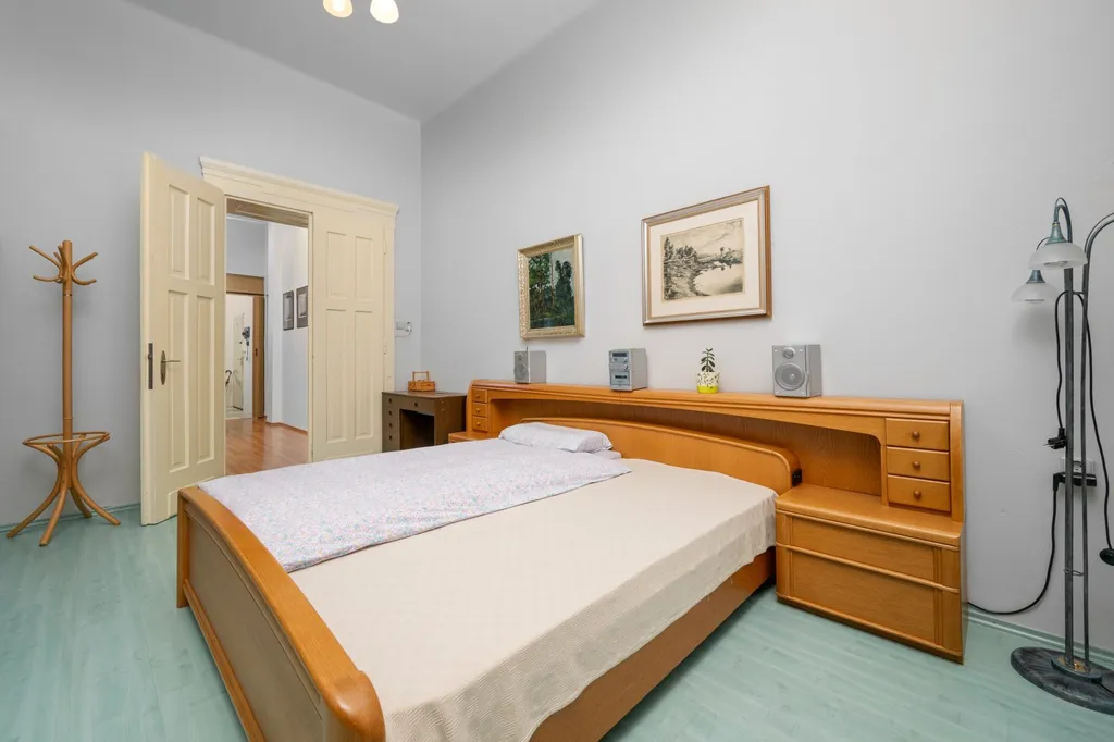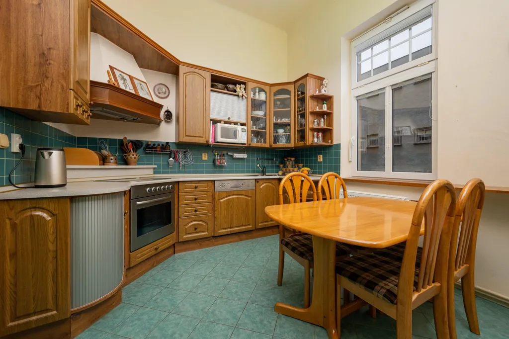 Dispozice bytu je velmi variabilní a nabízí dostatek soukromí i pro větší rodinu. Interiéru dominuje centrální vstupní hala o výměře necelých 19 m², která propojuje jednotlivé části bytu. Obytný prostor tvoří celkem pět pokojů. Největší z nich, obývací pokoj, má výměru přes 24 m². Dále jsou zde k dispozici tři prostorné pokoje vhodné jako ložnice či dětské pokoje a pátá, menší místnost o velikosti necelých 9 m², která je ideální pro využití jako pracovna nebo pokoj pro hosty. Kuchyně s jídelním koutem o výměře 11 m² je doplněna o praktickou spíž. Koupelna je společná s toaletou a je vybavena rohovou vanou se sprchovou zástěnou. Úložné prostory přímo v bytě rozšiřuje komora a k jednotce dále náleží velký zděný sklep o výměře přibližně 12 m².