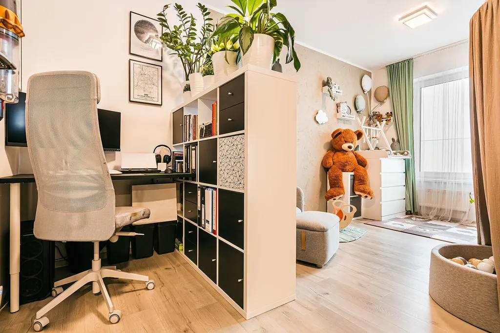 Dětský pokoj s pracovním koutem je vybaven otevřenou šatní skříní, komodou, poličkami, křeslem s lenoškou, pracovním stolem se židlí a policí s otevřenými boxy.