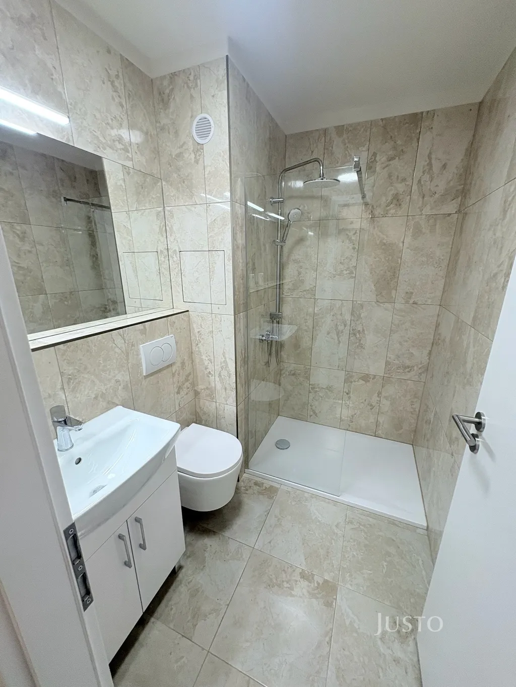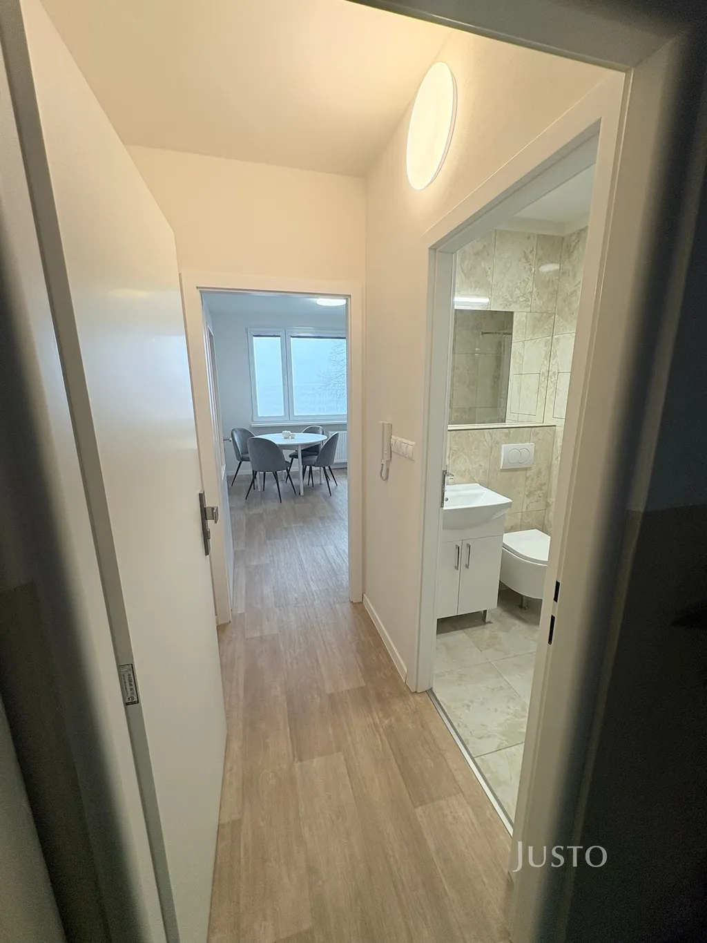 Byt prošel kompletní a nákladnou rekonstrukcí – disponuje zděným bytovým jádrem, moderní koupelnou s prostorným walk-in sprchovým koutem a WC, novými podlahami a kuchyňskou linkou včetně vestavných spotřebičů (elektrický sporák, digestoř, elektrická trouba, vestavná myčka nádobí, pračka, lednice+ mraznička), vysokorychlostní internet, TV.
