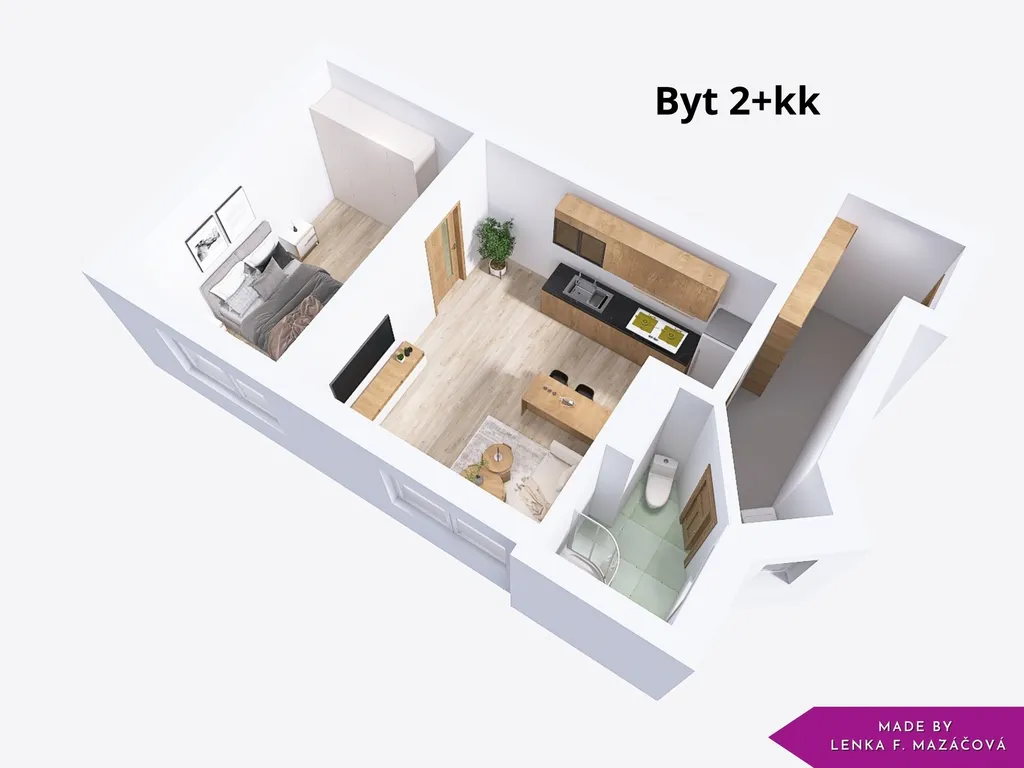 V chodbě narazíte na praktickou botníkovou stěnu se zrcadlem, kam pohodlně odložíte své věci při příchodu do bytu. Obývací pokoj je propojený s kuchyňským koutem a jeho součástí je barový pult se dvěma židlemi – ideální na rychlou snídani, kávu nebo večerní drink. Samozřejmě lze pult snadno odstranit, pokud preferujete více prostoru. Kuchyň je vybavena lednicí, elektrickou troubou s plynovými hořáky, takže vaření i pečení je radost. Velkou výhodou je klimatizace, která v letních měsících příjemně vychladí celý prostor a na podzim vás naopak potěší teplý a útulný večer. Ložnice je vybavena skříní pro vaše oblečení a osobní věci, a díky orientaci oken na východ vás ráno čeká jemné sluneční světlo.
