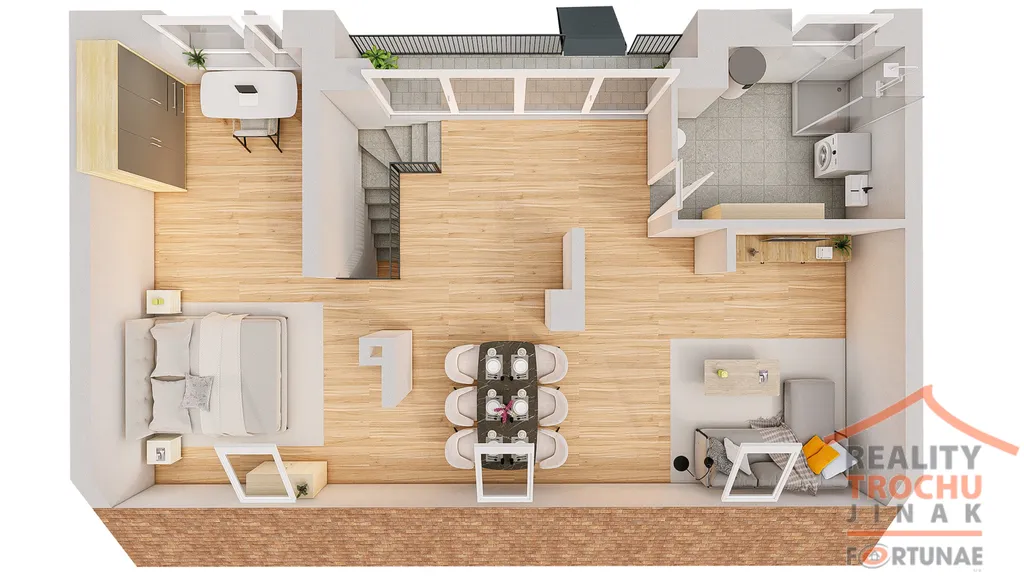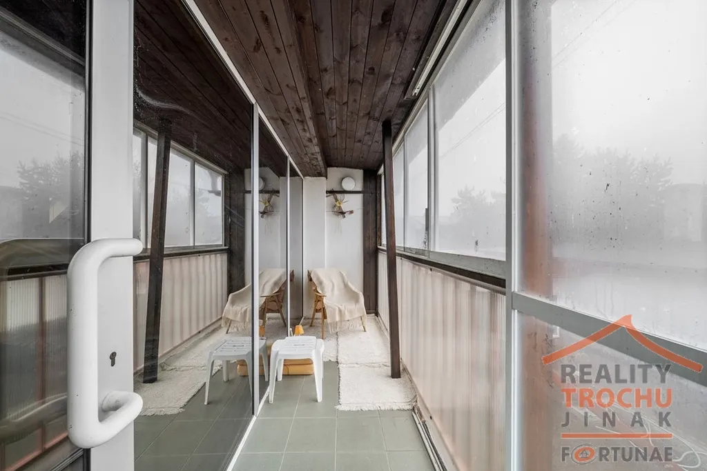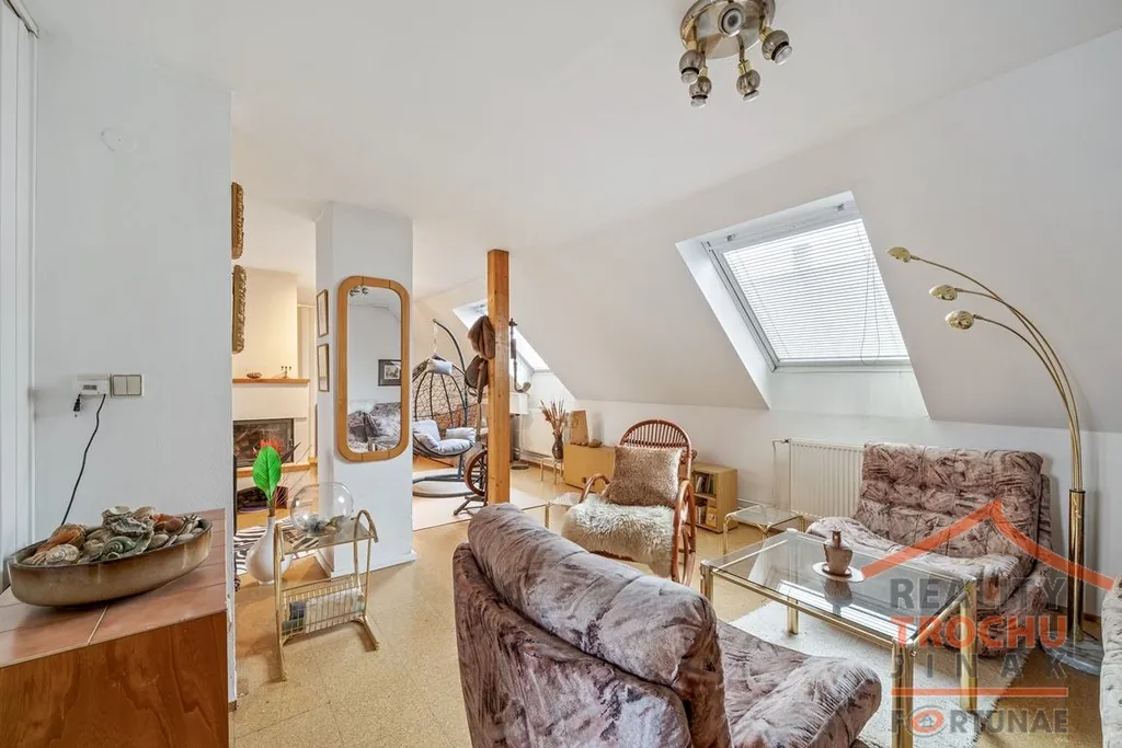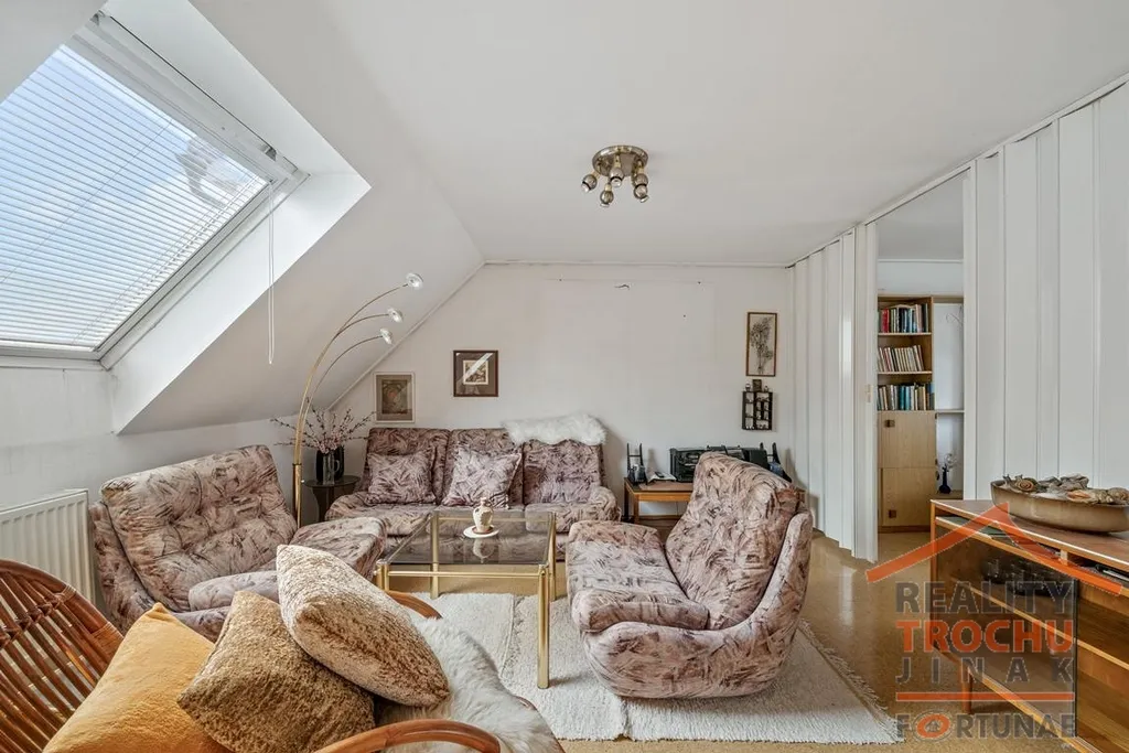 Podkroví: obytná hala, ložnice, koupelna (sprchový kout, WC, bidet), zasklen. lodžie. Celkem plocha 77 m².