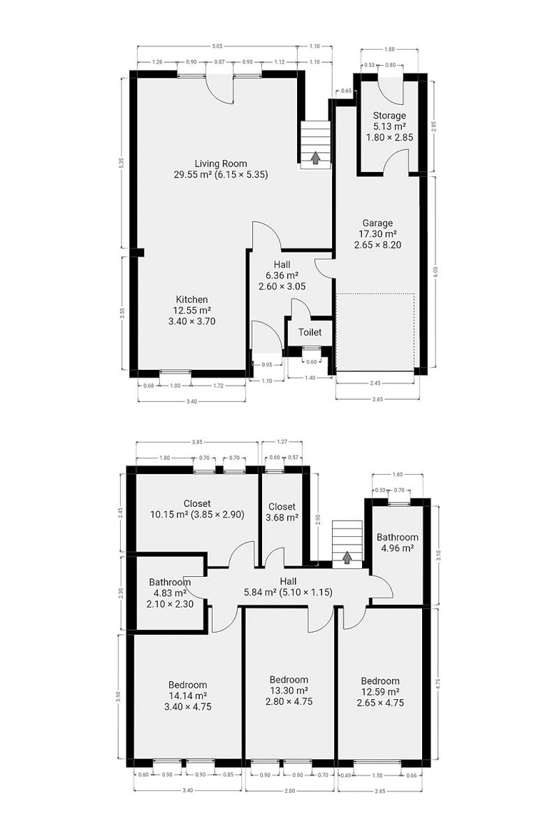 V přízemí domu se nachází vstupní předsíň s toaletou, garáž se skladem a obývací pokoj s kuchyňským koutem. V prvním patře najdeme tři ložnice, dvě koupelny a dvě šatny.