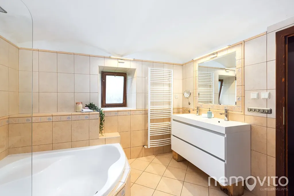 Obytnou část aktuální tvoří dispozice 3+kk. Obývák o velikosti 38 m2 nabízí dost místa pro skutečně velkou linku a jídelnu. Vytápět nemusíte jen v kachlových kamnech, je tu také teplovodní podlahové topení nebo vytápění čerpadlem vzduch-vzduch. Za kuchyní je k dispozici ložnice a velká koupelna, ve které je sauna. Ochladit se pak můžete v bazénu, který je na nejvyšší terase pozemku s výhledem na pivovar. Další ložnice je pak na druhé straně domu, kde je také prádelna, velká vstupní chodba s místem pro šatnu a ještě jeden pokoj (s pískovcovou zdí), přes který je přístup také do penzionu.