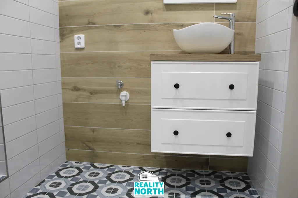 V koupelně a na WC je položena dlažba, v místnostech vinilová podlaha.